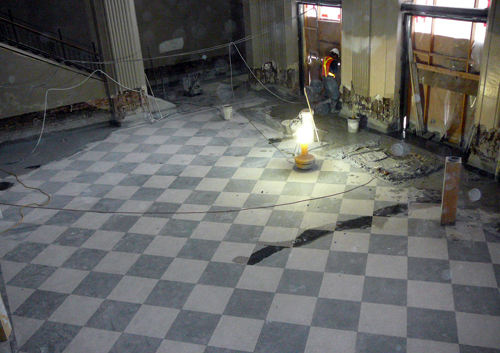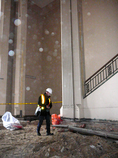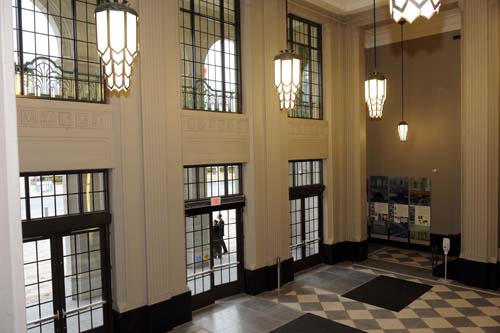A few very quick photographs from the restoration of the former Automotive Building north lobby. This part of the project included the removal of a number of unsympathetic modern additions, and a significant regrading of the original floor slope to accommodate contemporary universal accessibility requirements. Extensive metal work and finishes were also replicated or restored (including the amazing pendant light fixtures seen in the bottom-most photograph), and new windows installed replicating the original design and colour.