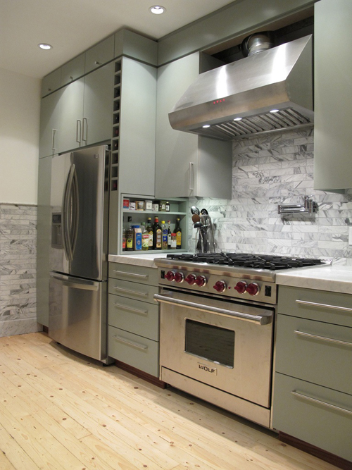 The custom cabinetry by Helps Studio is primarily of slab doors lacquered in “Pigeon” by Farrow and Ball, with a butler’s pantry closet and upper cabinets out of rosewood. Containing the fridge, for convenience and to give more visual breadth, the sidewall accommodates a wine rack and counter-height open shelf for cooking oils and salts. Other cabinetry includes a food pantry, pot drawers, and fitted custom drawers for utensils, spices and garbage/recycling.