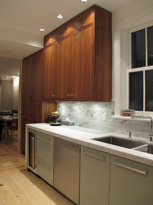 Some amount of debate went into choosing the counters. The intent was to choose a light stone counter which would still be able to hide stains and marks. The final choice was a particular slab of carrara bianco marble with veins and clouding of grey and black verging to brown and purple in a honed finish. The backsplash is in the same material in a 2×8 tile format. The counter has a thick 2” mitered edge and has been book matched to include a wrapped end adjacent to the rosewood that introduces the view from the dining room.