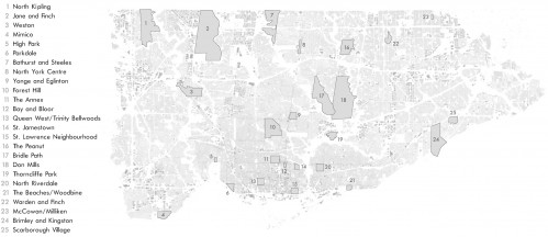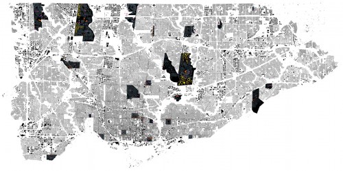 Figure-ground map of Toronto, highlighting selected neighbourhoods for study, and their colour-coded composition by building type. Please note that this map is presented 7′ tall by 15′ long at the installation.