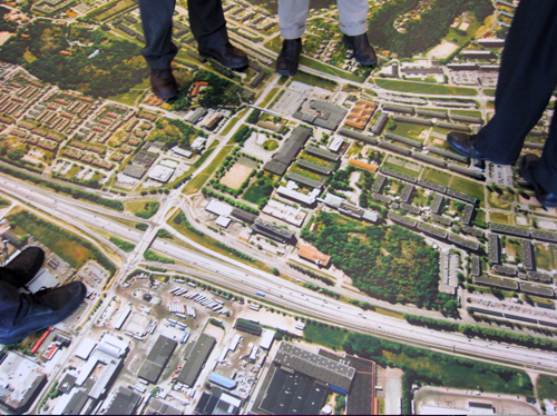 A large map of neighbourhood on the floor in the local community centre.