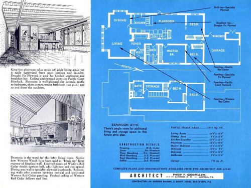 … the national program spanned from 1952 and 1955, and was sponsored by the BC Softwood Lumber Association. All homes were open for public viewing following construction to demonstrate the innovative ways they planned for modern life, used wood products and furnished with modern amenities and appliances. The interior of the homes were furnished by Eatons, employing primarily furniture and textiles from Canadian designs, selected by the National Industrial Design Council of Canada. Of the 11 homes built across Canada, this is the only example in Quebec.