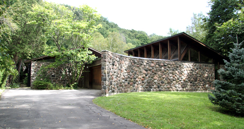 Rough flagstone walls create a monolithic appearance from the street, and curve outwards to embrace the incoming car – a move reminiscent of the ground level of Le Corbusier’s Villa Savoye. A dark wood roof tilts up to the North, forming clerestory windows that allow light to filter into the building. The rear wall of the house is all glass, opening up to the golf course behind. The house currently has no heritage designation.