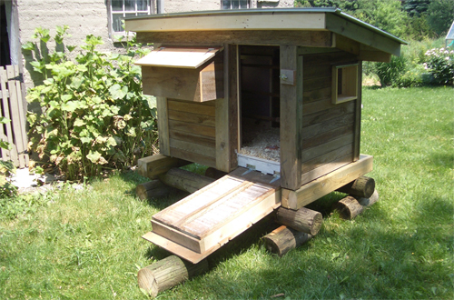The entire coop rests on some discarded sections of telephone poles that were found behind the barn and the fence is made of a score of palettes, which the local hardware stores are happy to unload.