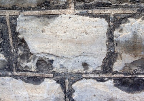 In the image above, the jointing mortar is visibly paler than the brick, and the lime putty is a much brighter white overlaid on both brick and mortar. The image below, which shows a detail from the Stone Distillery at Toronto’s Distillery District, shows how the technique of tuckpointing can be used in stone masonry as well.