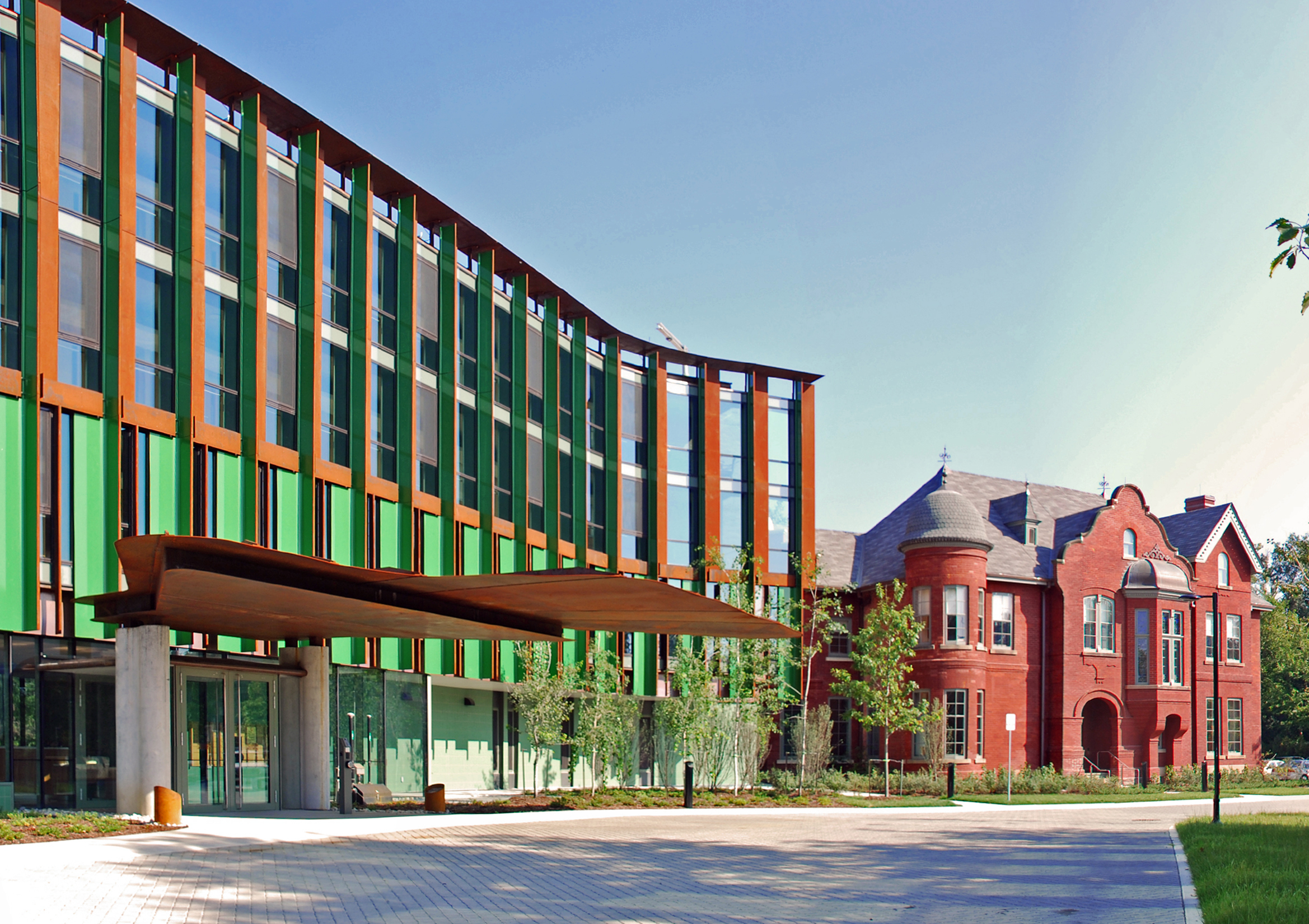 Taylor House (above, right) was awarded a CAHP award for Conservation of Buildings. This award recognizes “outstanding achievement according to the heritage field, referring specifically to the principles of conservation stated in the Standards and Guidelines for the Conservation of Historic Places in Canada.” The project, a collaboration with Shim-Sutcliffe Architects, who designed a wonderful new facility (above, left), adapts and conserves an 1885 masonry Queen Anne home to serve as part of the Residence of the Sisters of St. Joseph of Toronto. Learn more about Taylor House on our portfolio page.