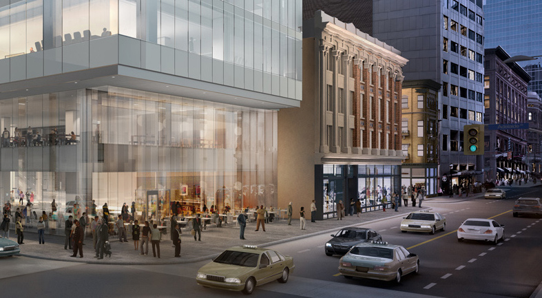 At the time of this posting, the heritage masonry has all been reconstructed, repaired, and repointed; the upper cornice is being re-fabricated based on historic photographs and drawings; and the new GFRC façade is slated to be installed in summer 2014.