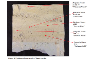 Sydney Presented on aspects of paint technology, assessment and methodology and how they apply to ERA’s work on the GCC. Due to the condition of the original faux travertine plaster walls (scagliola) and the extreme difficulty of using the original plaster technique for repairs it was decided to replicate the original appearance of the tinted plaster faux travertine with paint and provide a unified appearance. Her presentation focused on the development of the paint technique and colour selection for the imitation travertine surfaces that honour the original design intent. The colours for the faux travertine were derived from analysis of the original tinted plaster. The painted technique was meticulously tested on mock surfaces and under various lighting to emulate the original faux travertine surfaces in the building.