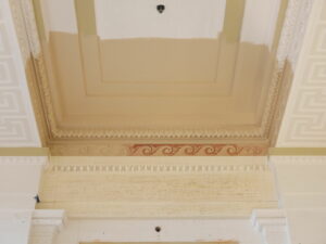 Finishes include marble floors and wall paneling, imitation travertine wall finishes (a patented process involving the application of tinted plaster with a texture characteristic of travertine laid in ashlar coursing, elaborate plaster ceilings and suspended plaster ceilings in the two large spaces. The rehabilitation project, through careful paint and material analysis, allowed the revealing of the original colour and material palette of the building that had been concealed over time.