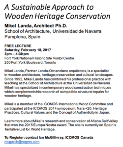 Mikel Landa, a specialist in wooden architecture, heritage preservation and cultural landscapes discusses a sustainable approach to these topics at the Fort York National Historic Site Visitor Centre at 250 Fort York Boulevard on Saturday, February 18th from 3:00pm – 4:30pm. Read the posting for details.