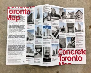 Copies of the new Concrete Toronto map are now available at the U of T Bookstore “Toronto” section, near the concrete buildings on campus, and Spacing Magazine.