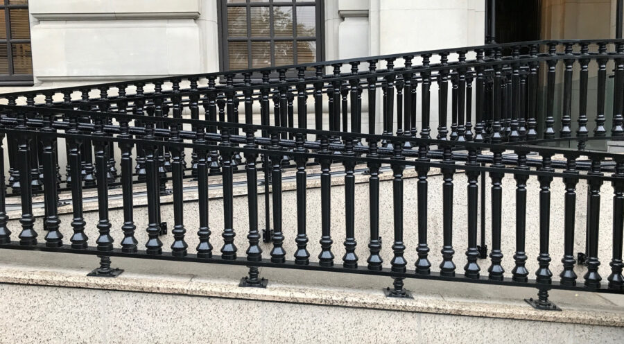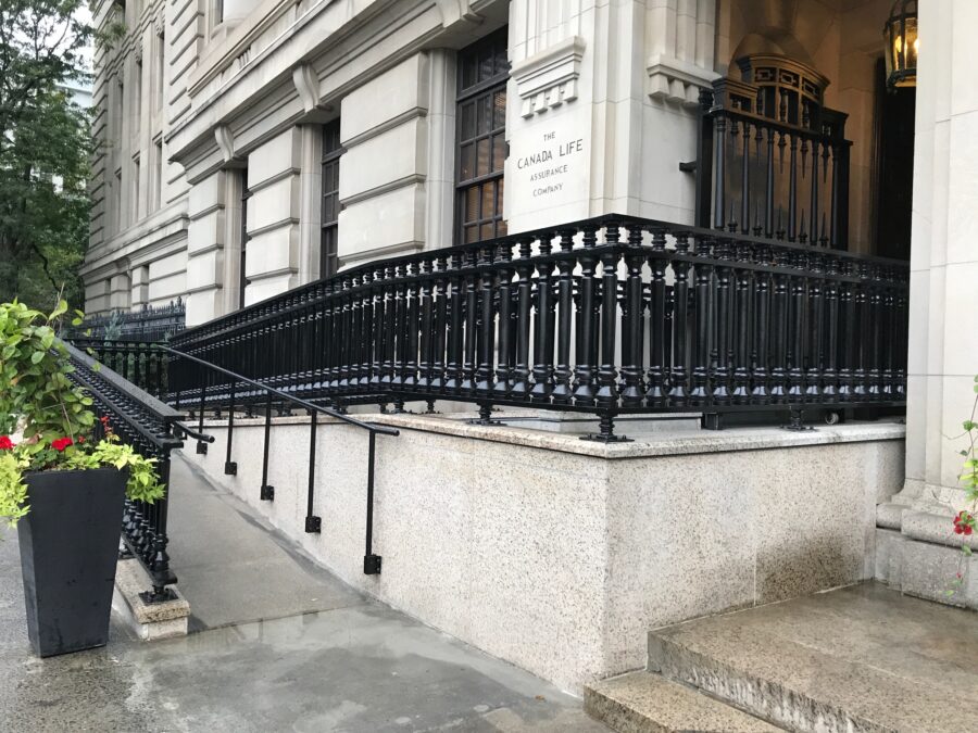 To give the students a better sense of what this design approach could look like, we reviewed ERA projects like the Canada Life Building (330 University Avenue, Toronto). Often, accessible entrances are placed in areas of the building other than the principal entrance, a practice that is now widely regarded as a human rights issue. Adding an accessible ramp to the front of the building, without negatively impacting the existing site’s architecture, demonstrates a commitment to accessibility and heritage conservation. The design has minimal impact and is reversible, a core element of heritage conservation, and the ramp design complements the character-defining elements of the building.