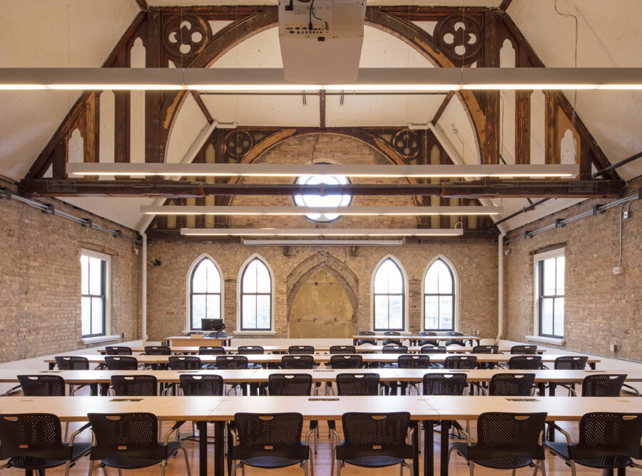 The recent renewal of the south-facing 19th-century Gothic revival building and contemporary addition – home to the John H. Daniels Faculty of Architecture, Landscape and Design – is a showcase for the city and an international focal point for education and research on architecture, art and the future of cities. The rehabilitation and new addition at One Spadina Crescent provides a significant expansion to the heritage building for use by the faculty and its students as design studios, fabrication shops, a multi-functional principal hall, library programs, social spaces and offices. The addition was conceived to fill in the “U”-shaped space vacated by demolition of previous additions to the original 1874 Knox College on its north side, thereby preserving the original heritage structure and integrating existing and new program space for optimal use of the finite site.