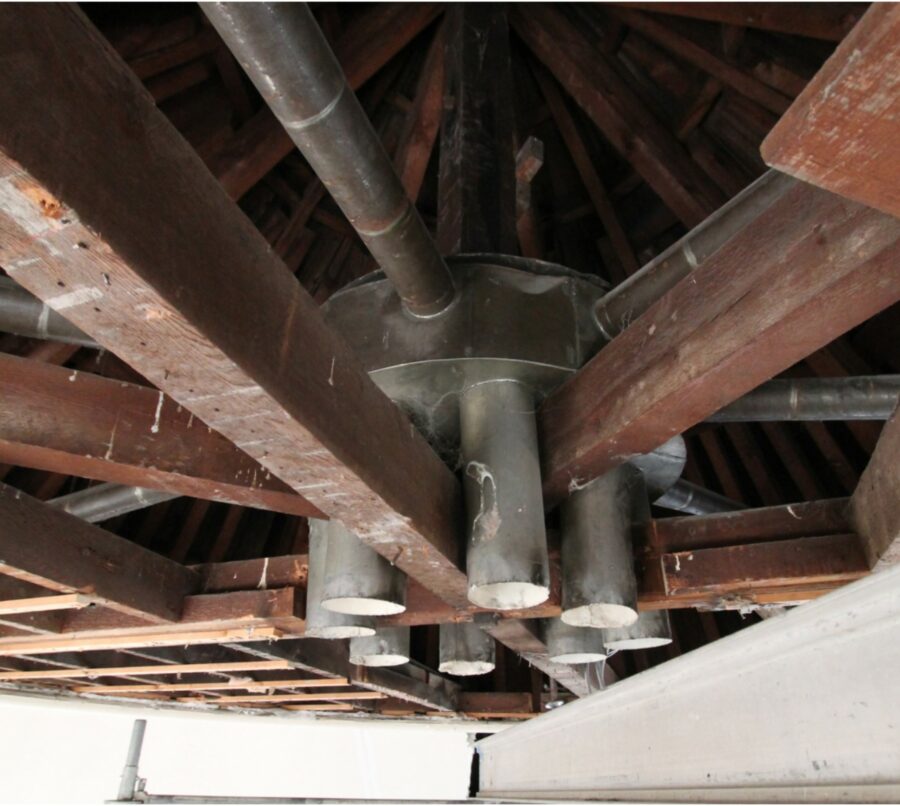 Au cours de la construction, nous avons fait une découverte intéressante lorsque nous avons ouvert le plafond en dôme de la salle capitulaire Croft en retrouvant intact un réseau très ancien de conduits de ventilation fabriqués en étain, qui utilise le plan circulaire de l’espace pour encourager la ventilation naturelle. Les conduits pourraient dater de l’époque où cet espace avait sa fonction initiale de laboratoire de chimie, quand le plafond en forme de dôme fonctionnait comme une hotte. Nous avons décidé de laisser cet élément intact dans le plafond pour que les générations futures puissent le redécouvrir.