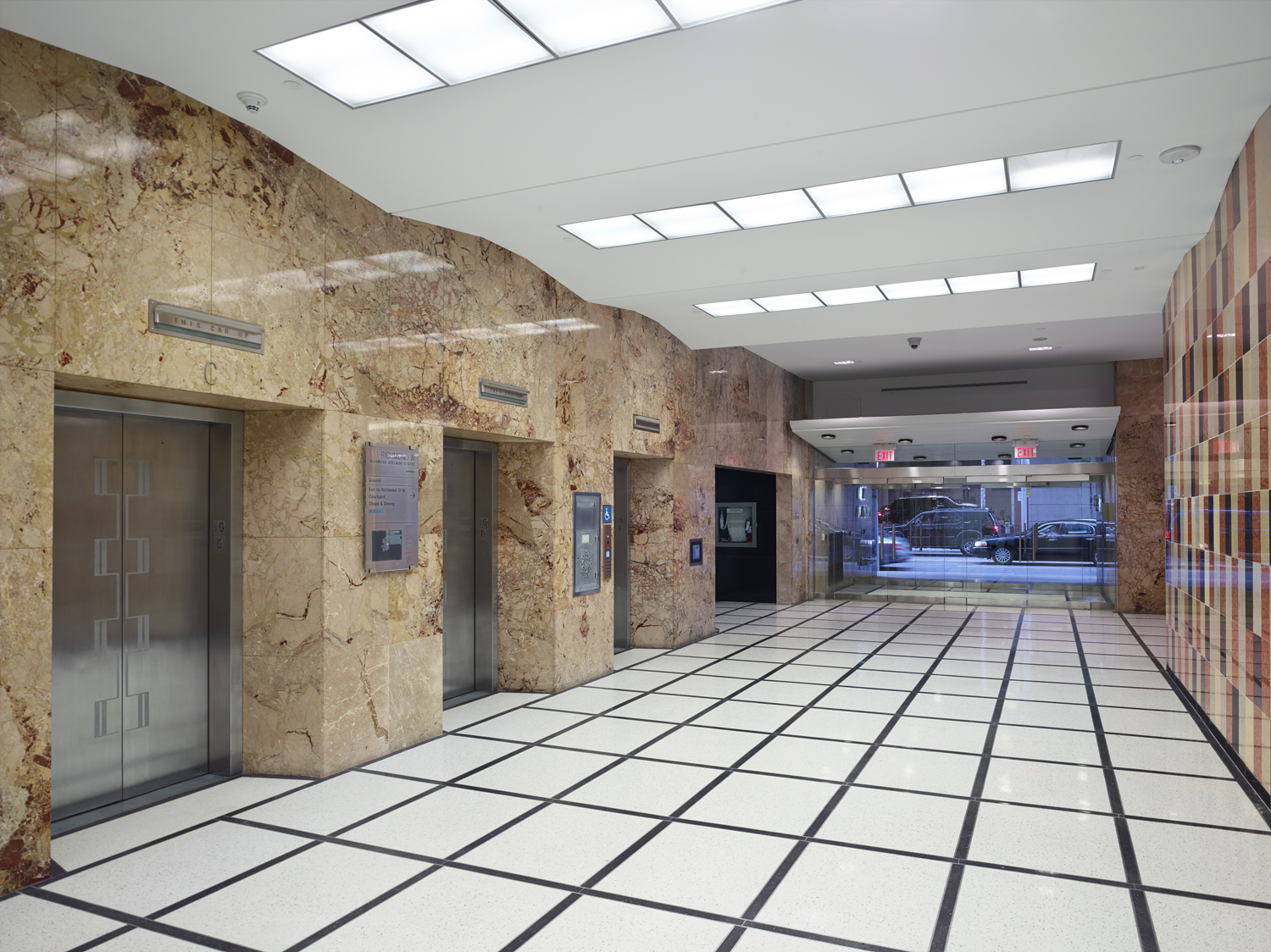 Les travaux de restauration réalisés par ERA ont permis de retrouver le hall d’entrée de l’édifice, au design ludique, avec ses planchers en terrazzo, son plafond ondulé et ses panneaux de marbre multicolores, qui avaient été dissimulés pendant des décennies.