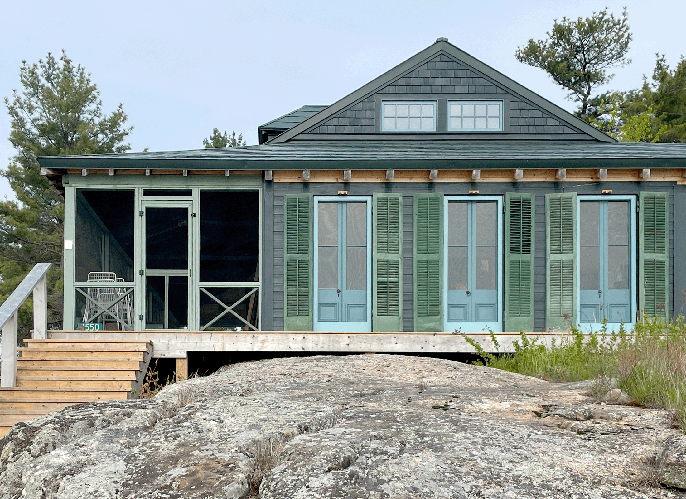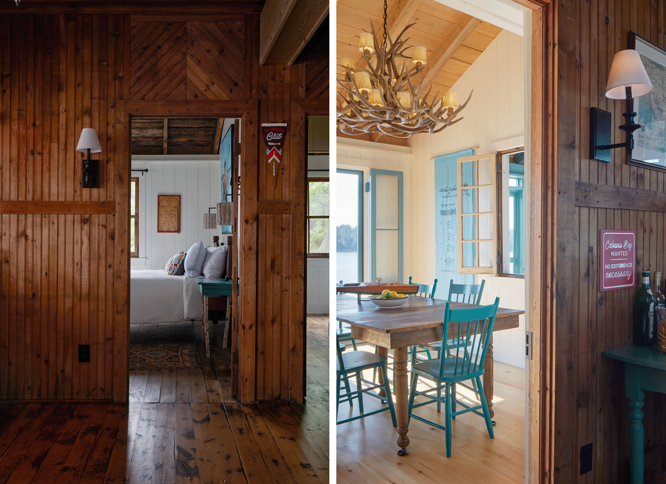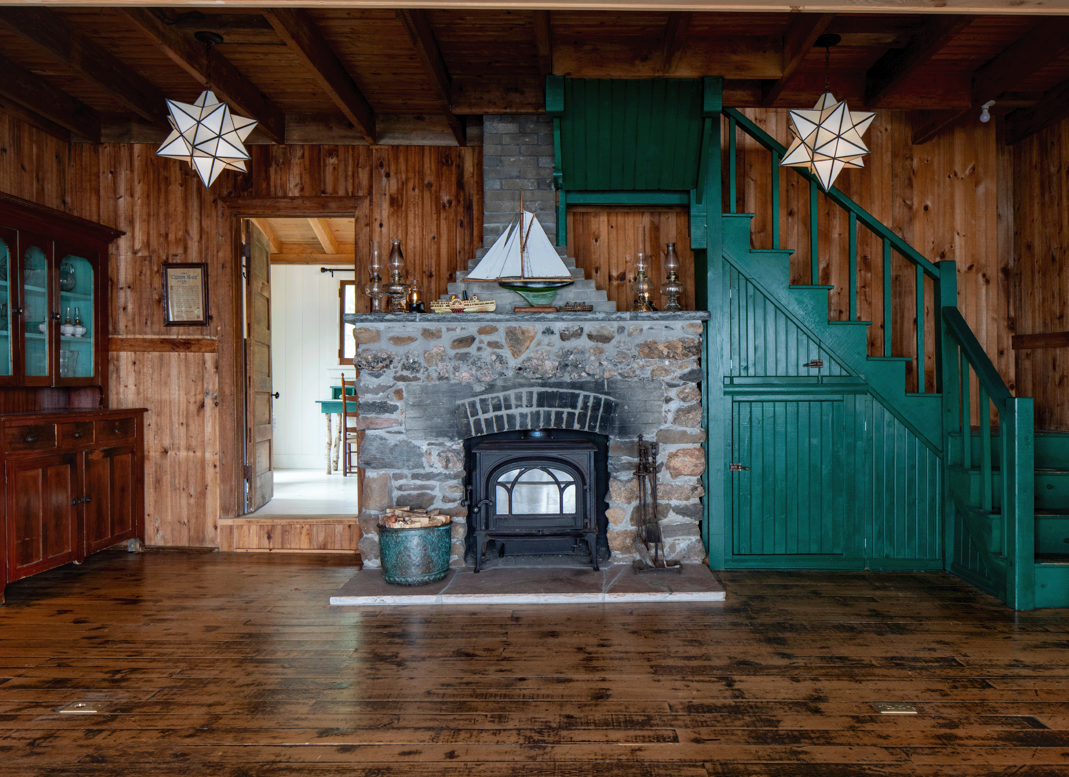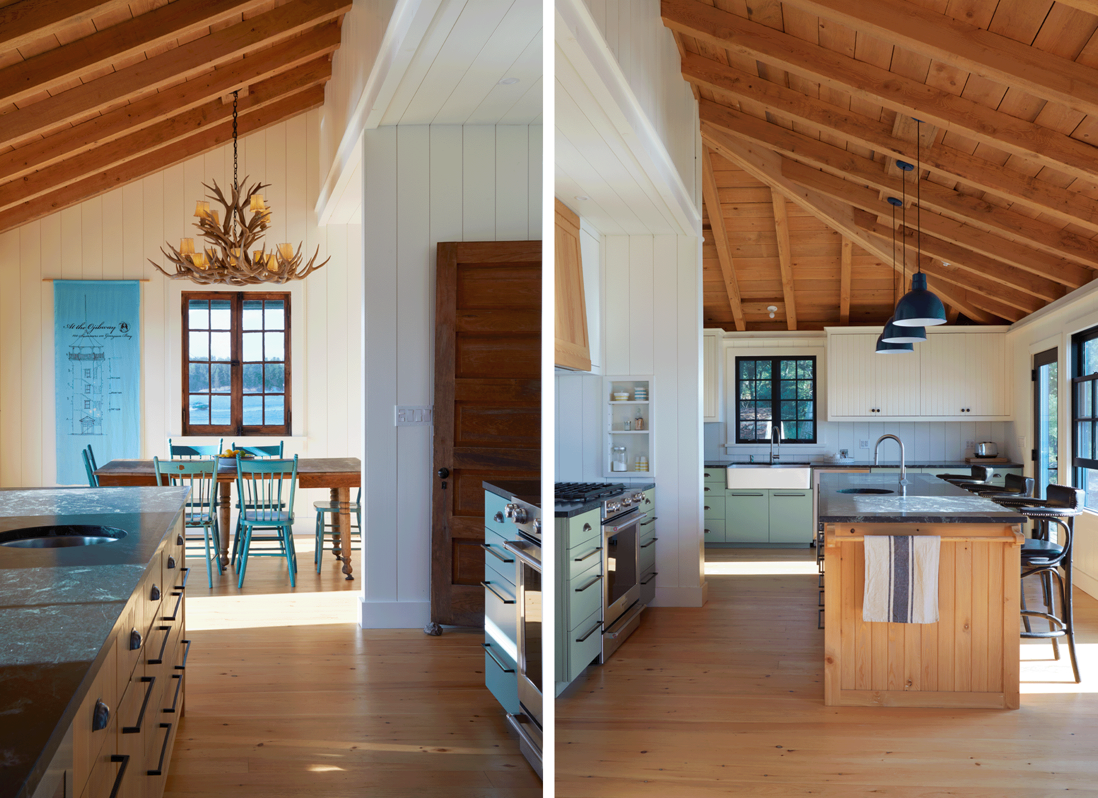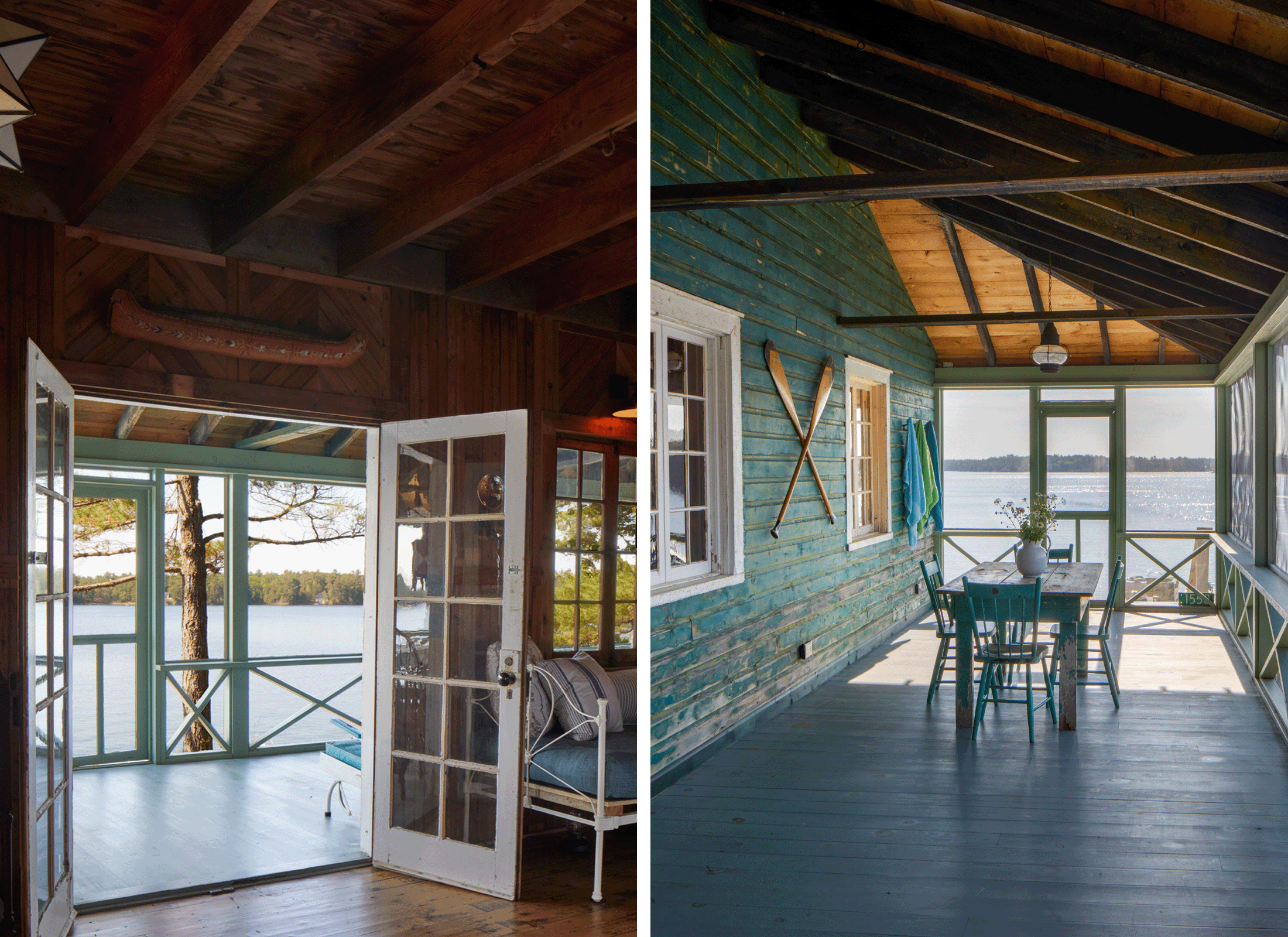 Ce chalet, qui a été acheté en 2020 par ses propriétaires actuels à un descendant de la famille du propriétaire initial, se trouvait dans un état de détérioration avancé. ERA a travaillé avec les propriétaires pour préserver son caractère historique, y compris les fenêtres originales et le foyer en pierre, tout en apportant les modernisations nécessaires. Le volume central à pignon a été stabilisé et restauré, et une nouvelle toiture en acier plus durable a été installée pour qu’il résiste mieux aux intempéries typiques de la baie Georgienne. Les pièces périmétrales ont été reconstruites pour stabiliser la structure en bois et en pierre d’origine et pour offrir des espaces ouverts modernes plus adaptés au style de vie contemporain.