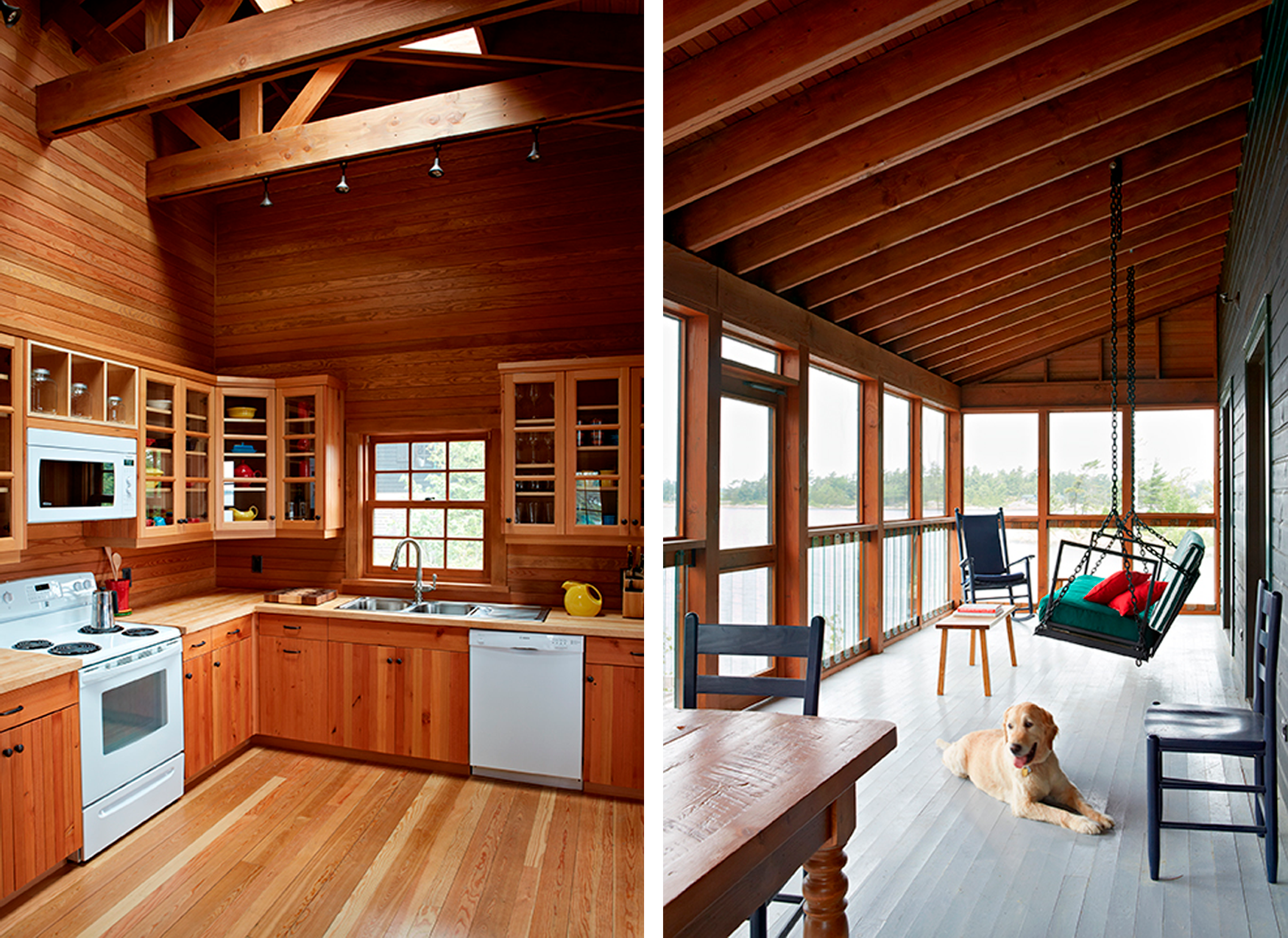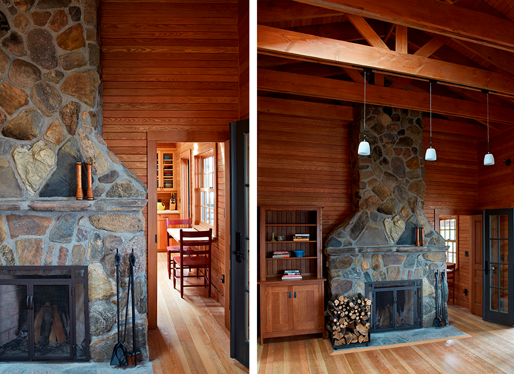 Ce chalet historique hors réseau a été la proie des flammes lors d’une réouverture printanière. Les propriétaires voulaient le reconstruire en respectant le plus possible son apparence originale; un plan directeur a donc été préparé pour la compagnie d’assurances supervisant le projet. Le foyer de pierre a été reconstruit selon le modèle Rumford et le bâtiment a été rebâti, mais avec des modifications améliorant la circulation intérieure et assurant le respect du code du bâtiment de l’Ontario. Tous les matériaux ont été choisis afin de correspondre le plus possible aux matériaux d’origine. Aux fins d’assurances, le chalet situé sur une île a été raccordé au réseau électrique et un nouveau système septique a été installé.