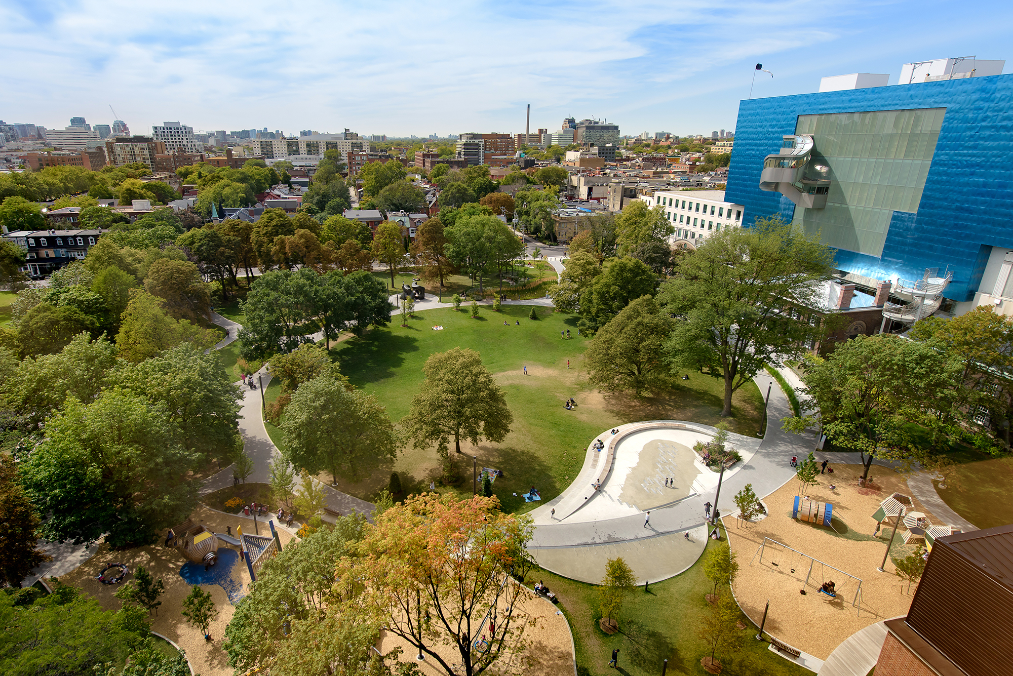 Le parc Grange, un espace ouvert public de deux hectares, situés au sud du Musée des beaux-arts de l’Ontario, est un rare exemple d’un ancien domaine résidentiel du début du XIXe siècle. Bien que les terrains aient considérablement évolué, la disposition en terrasses, axiale et elliptique irrégulière dans le style jardin pittoresque conserve un haut niveau d’intégrité. Aujourd’hui, le parc sert d’espace public ouvert, conformément à son association historique avec l’horticulture, les loisirs et les arts. Ayant rempli des fonctions publiques depuis le début du XXe siècle, le parc a une valeur contextuelle à titre de point de repère culturel important et d’espace civique et récréatif apprécié dans son quartier situé au centre-ville.