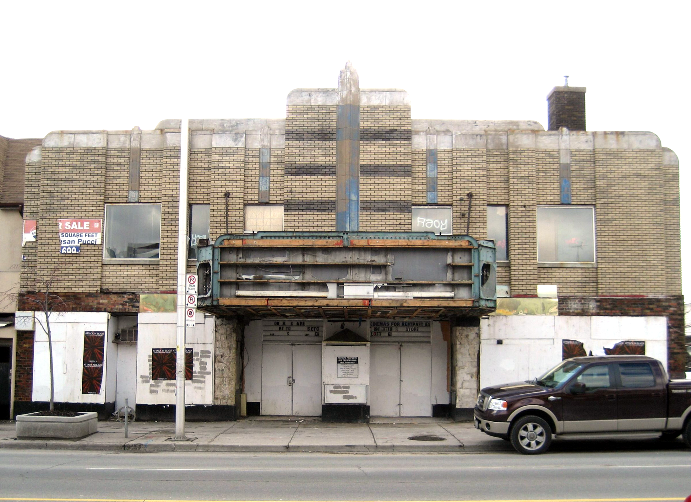 Le cinéma Allenby (aussi appelé « 99cent Roxy ») a ouvert ses portes en 1935 et a été conçu par le cabinet d’architectes torontois Kaplan and Sprachman qui a également conçu environ 75% des cinémas au Canada entre 1921 et 1950. À l’époque de la Grande Dépression, le cinéma Allenby était un fleuron de l’avenue Danforth en raison de son style « art moderne » et de sa taille par rapport aux immeubles commerciaux adjacents. En effet, le cinéma Allenby a contribué au développement économique du quartier de Danforth, près de l’avenue Greenwood. Il s’agit d’un bien patrimonial désigné en vertu de la partie IV de la Loi sur le patrimoine de l’Ontario, car il est un exemple représentatif du style des cinémas construits pendant l’entre-deux-guerres.