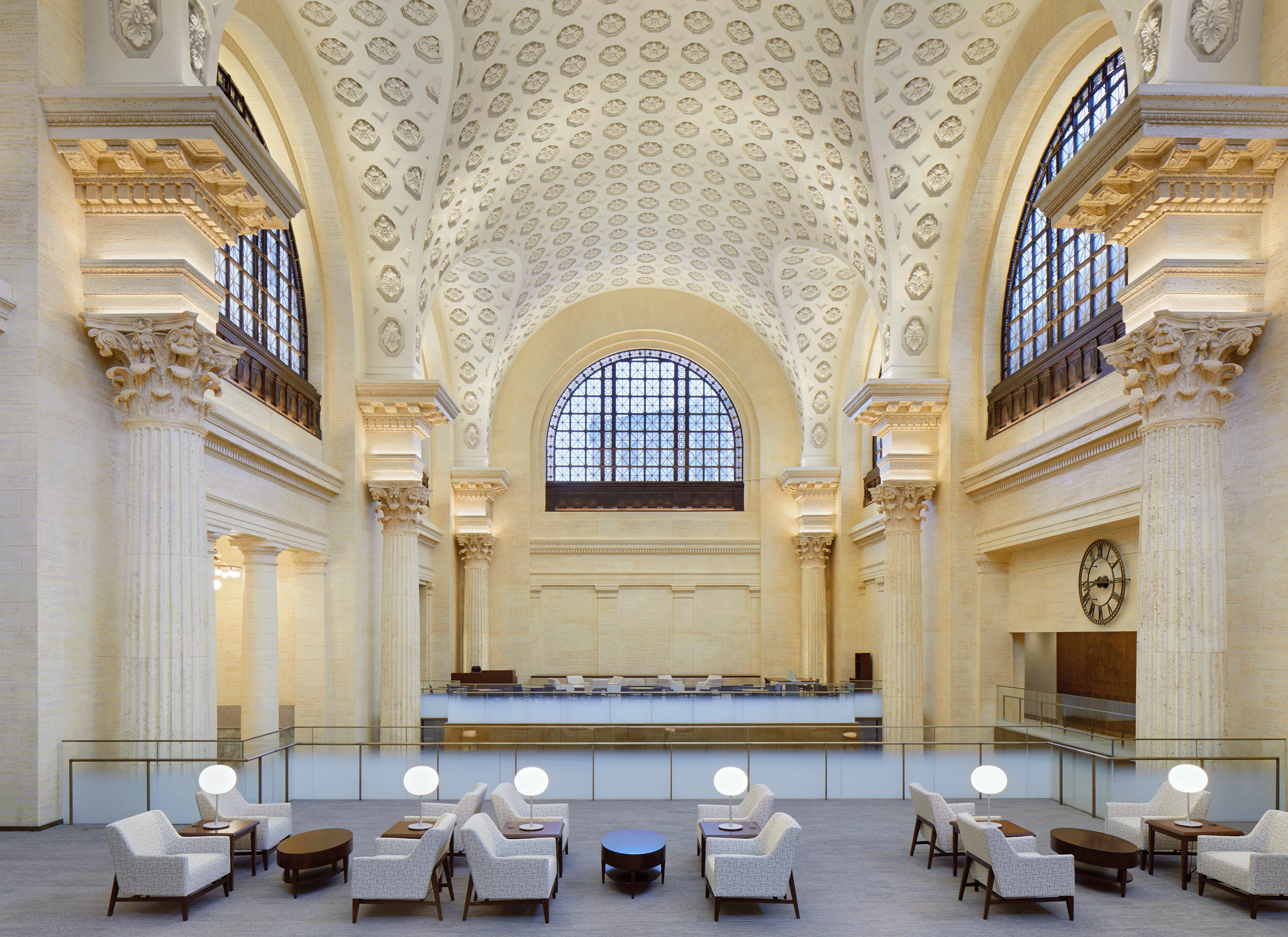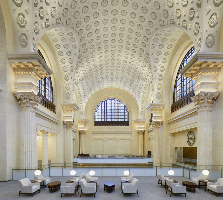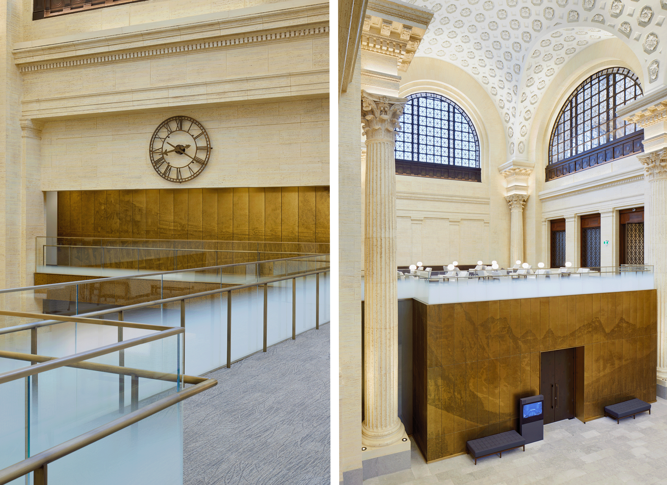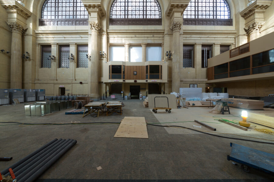La réhabilitation a révélé des éléments historiques du bâtiment qui avaient été dissimulés lors de la première requalification de la gare Union en centre de conférence du gouvernement, comme le caractère théâtral de la circulation intérieure, la progression axiale des espaces, l’utilisation spectaculaire de la lumière naturelle et de la riche palette de matériaux, tout en répondant aux exigences fonctionnelles et techniques du projet. Les éléments intérieurs, tels que les imitations de travertin et de marbre, ainsi que les boiseries ont été réparées et restaurées. De plus, les ajouts précédents dans les grands espaces intérieurs ont été retirés, comme dans la salle d’attente générale et le hall d’entrée. Compte tenu de son caractère opulent, l’édifice est bien adapté au programme du Sénat et peut soutenir ses traditions cérémonielles.