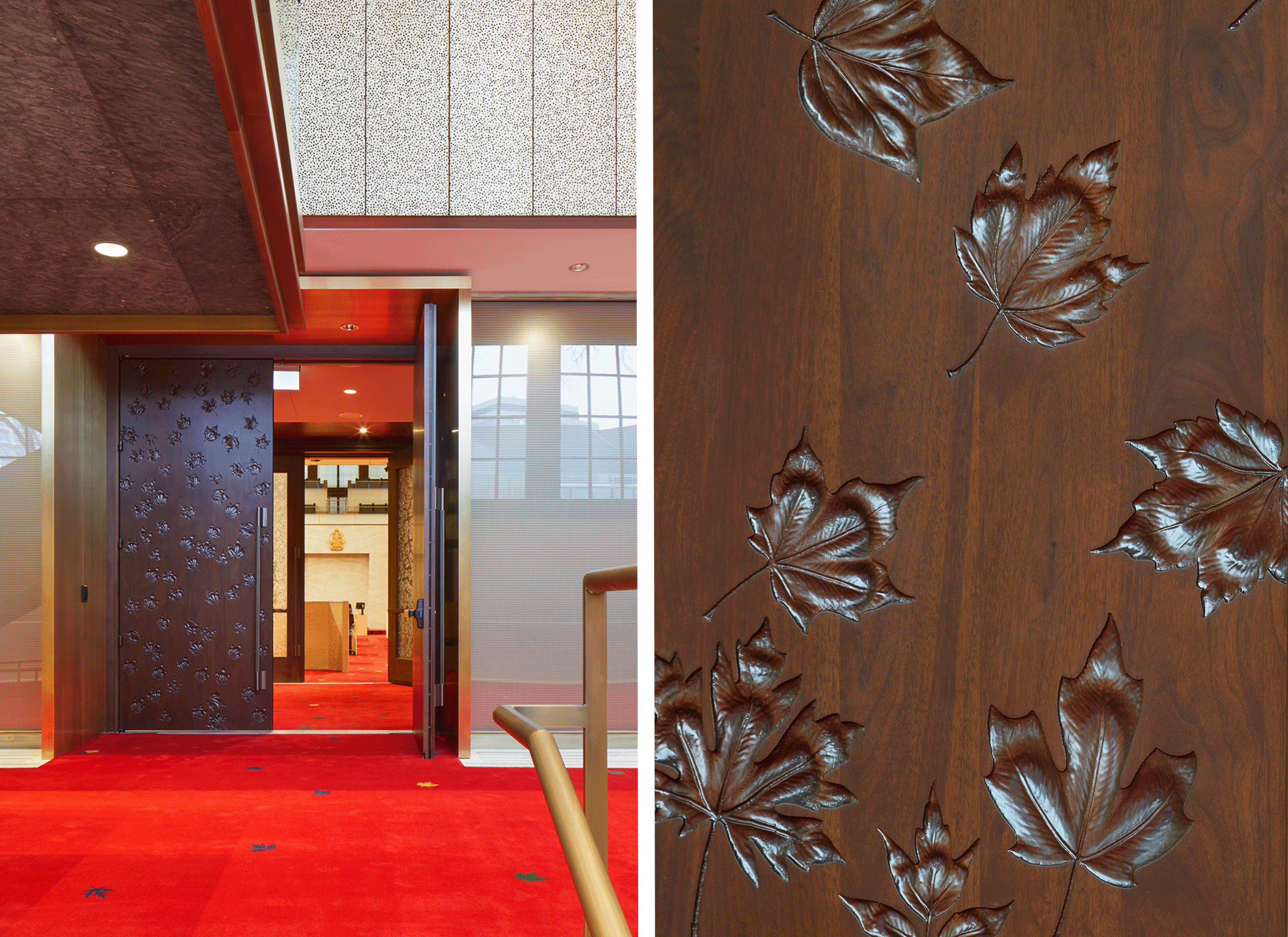 La réhabilitation des deux plafonds de plâtre suspendus a été l’un des grands défis techniques en matière de conservation. Composés de panneaux de plâtre à caissons préfabriqués suspendus à la structure en acier, les plafonds étaient en mauvais. Un certain nombre de panneaux ont fait l’objet d’une investigation et de tests afin de déterminer leur résistance et les phénomènes de dégradation typiques. Comme il n’existait pas de précédent approprié en matière de conservation du plâtre en Amérique du Nord, des expérimentations ont été réalisées au moyen de produits de conservation du Royaume-Uni. Après de multiples maquettes et essais, une stratégie de conservation n’ayant aucun impact sur la perception des plafonds vus d’en dessous a été élaborée et mise en œuvre, devenant un précédent pour la conservation du plâtre au Canada.