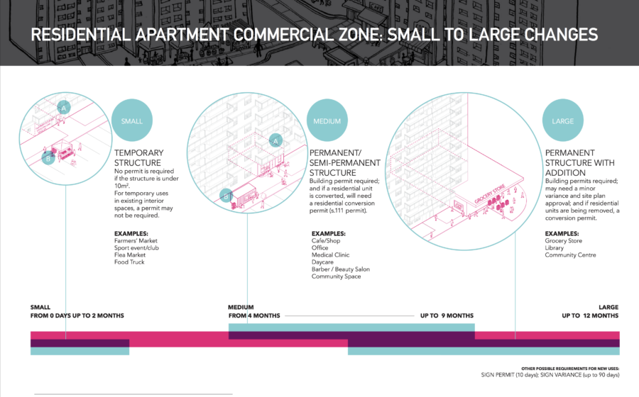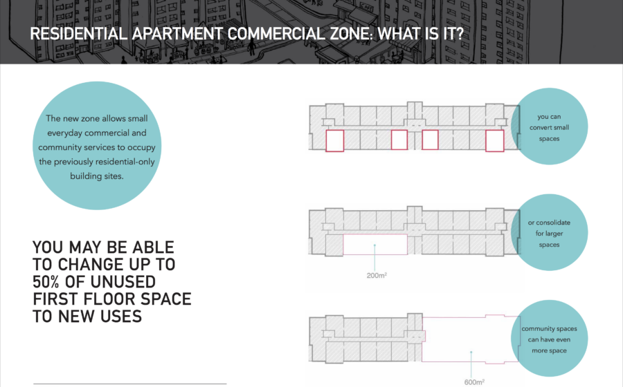 Le zonage Residential Apartment Commercial (RAC) permet des utilisations non résidentielles à petite échelle, telles que des marchés alimentaires, des boutiques, des petites entreprises, des classes, des installations communautaires et d’autres initiatives, sur près de 500 sites d’immeubles d’habitation qui étaient auparavant uniquement résidentiels.
