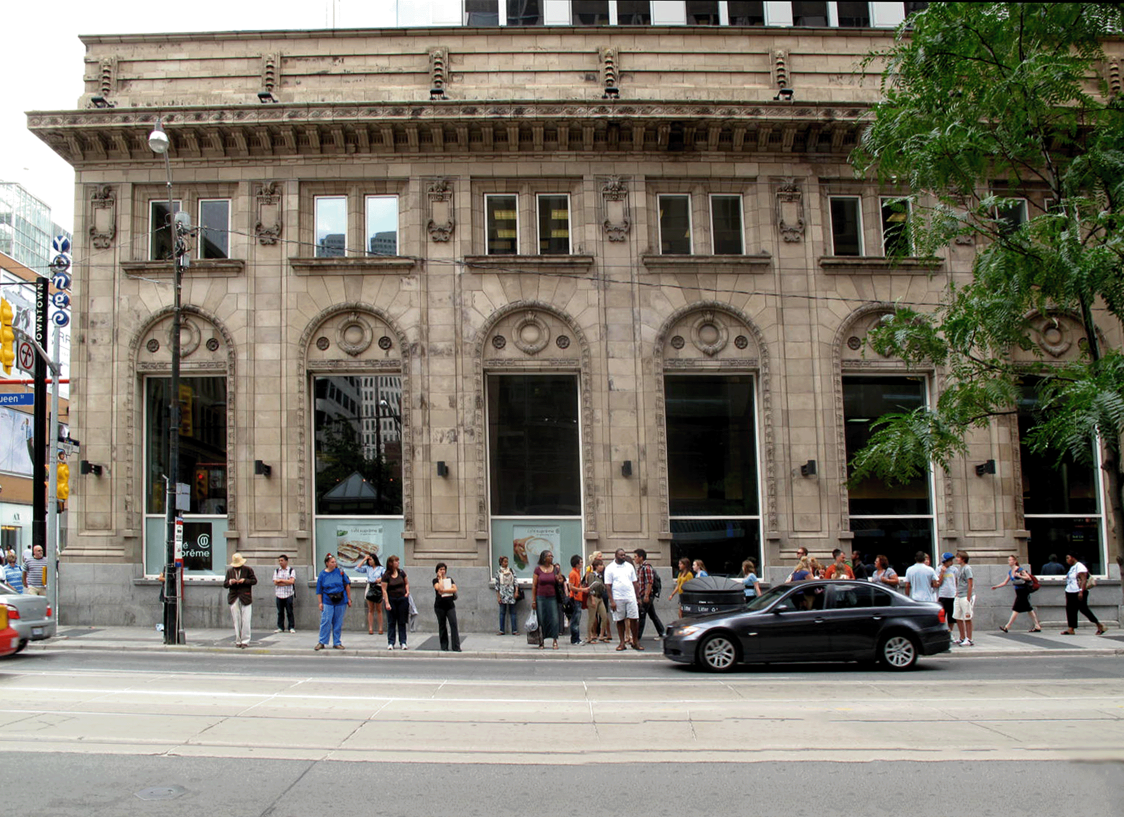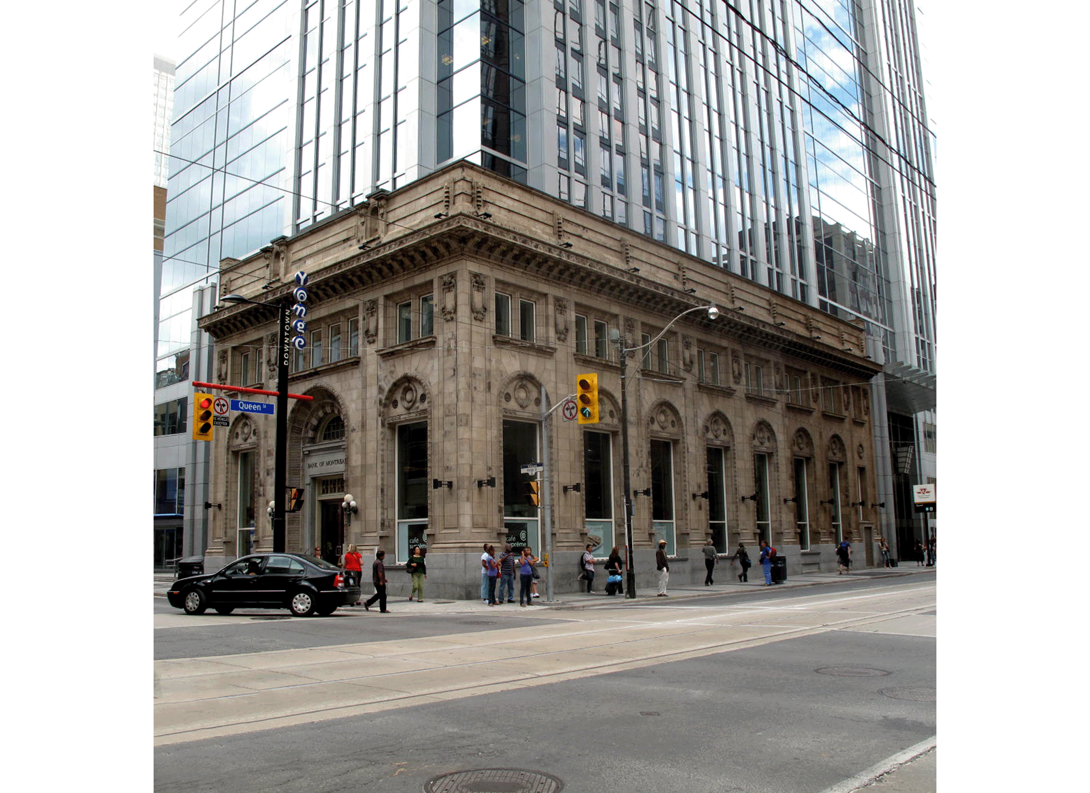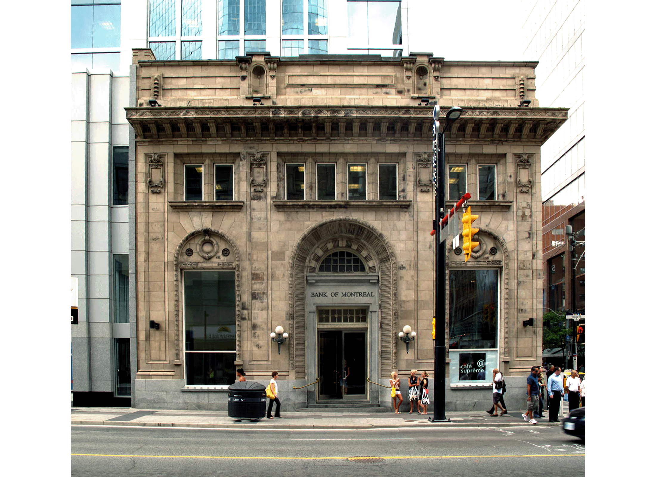 Construit en 1909-1910, cet immeuble de style édouardien baroque a été conçu pour la Banque de Montréal par le cabinet torontois d’architectes Darling and Pearson. Bien patrimonial désigné, cet immeuble se trouve au cœur du centre-ville de Toronto.