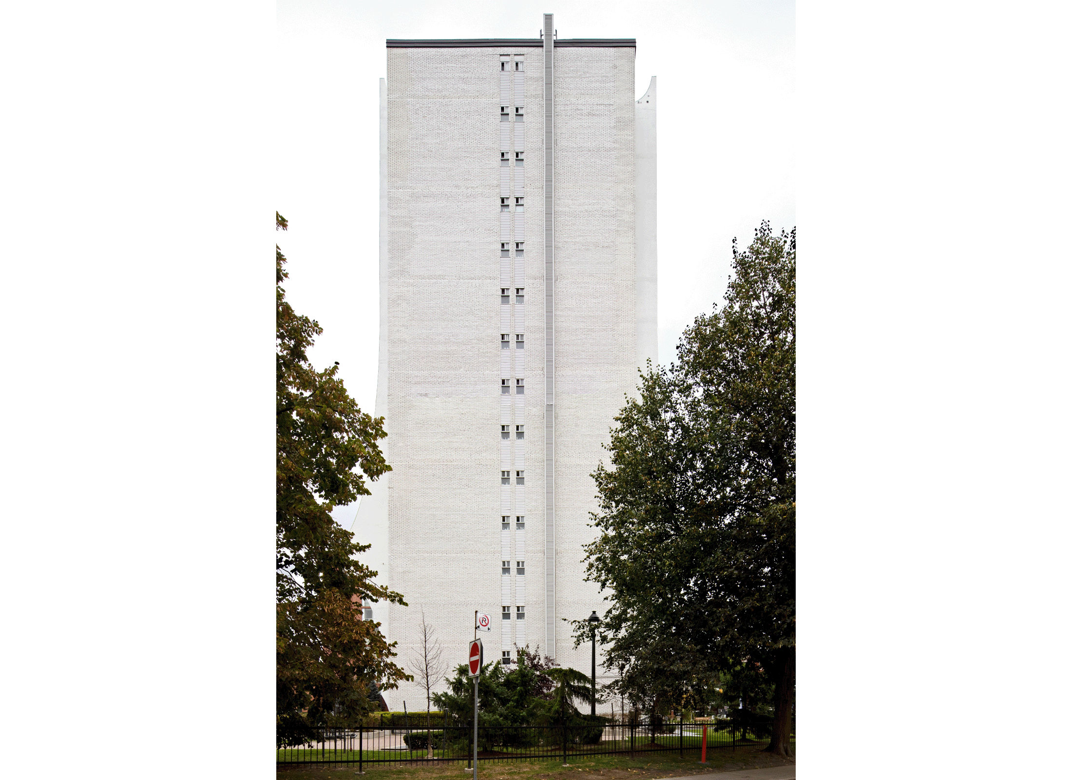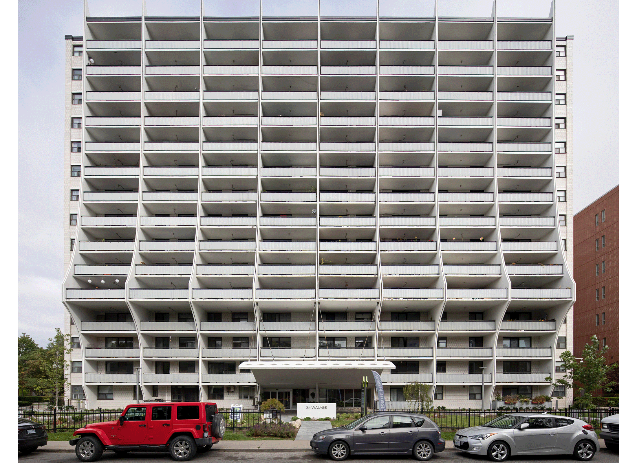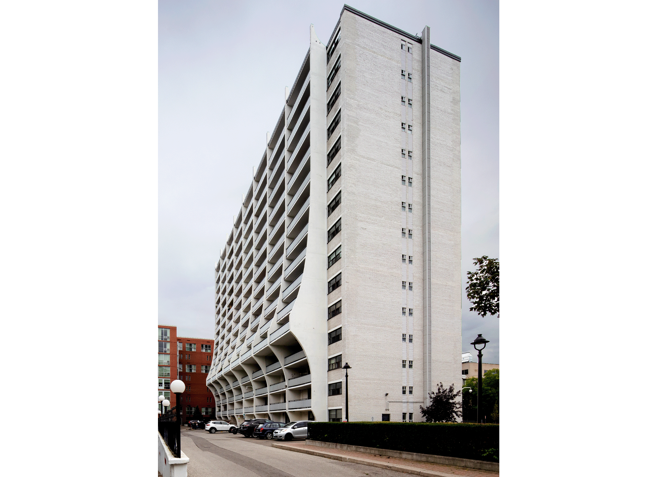 The project restored the postwar building and landscape to its original design intent, including the upgrading of the existing deteriorated concrete at balconies and shear walls, and select brick replacement at East and West elevations. Additionally, the rehabilitation of the iconic canopy and front entrance storefront glazing were performed for a new life cycle. Careful detailing and colour selection were key aspects to reinstating the original design intent.