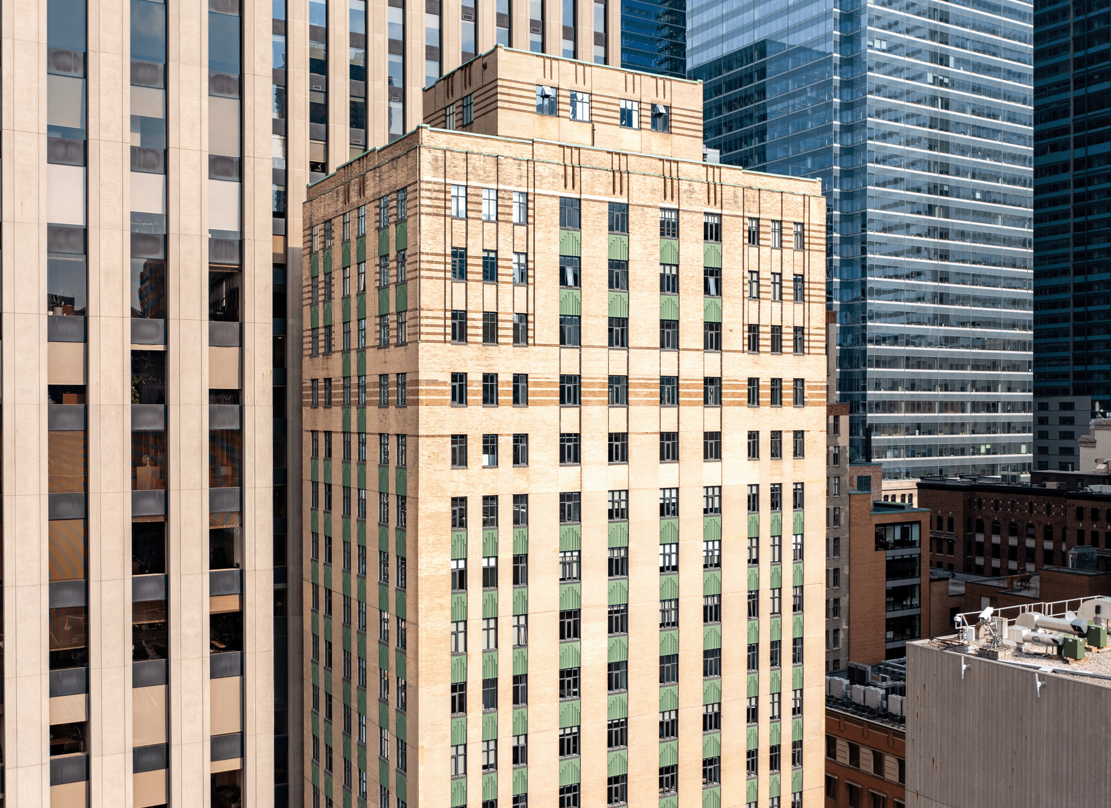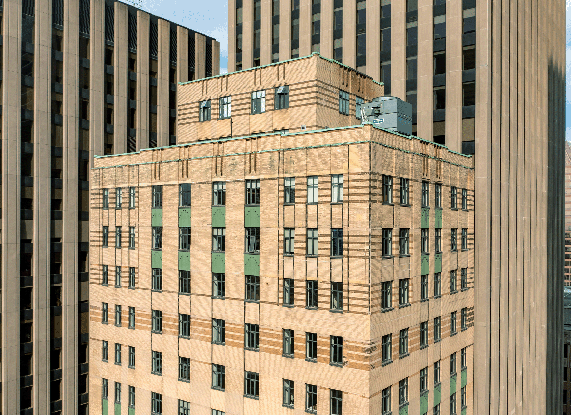 The façade restoration scope included general cleaning, masonry, and precast stone repairs, as well as the cleaning, repair, and repainting of the original precast stone spandrel panels.