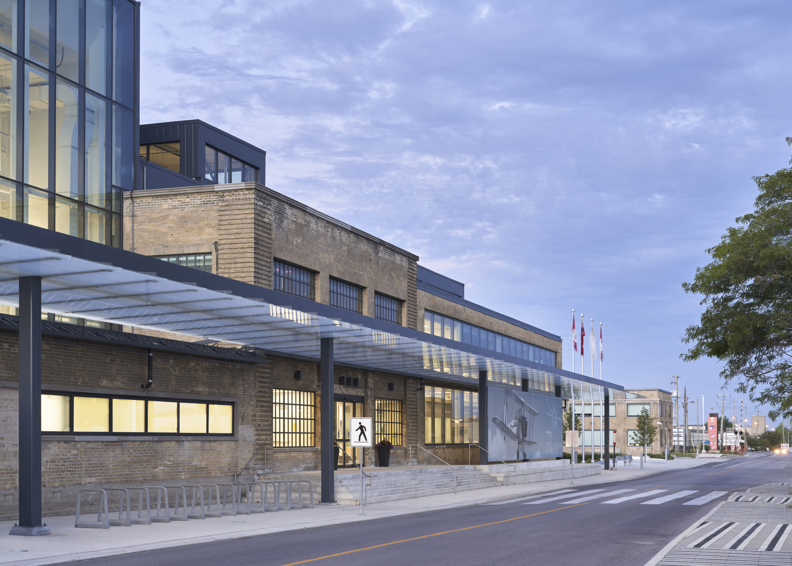 The Bombardier Centre for Aerospace and Aviation, Downsview Campus, expands and adaptively reuses a historic building that was once the centre of aviation manufacturing and design in Canada — transforming it into an innovative learning institution for Centennial College’s Aviation and Engineering Technology Programs. The new campus includes teaching, research, testing labs and learning spaces for aviation engineering and mechanics, along with student services, admissions, a library, and dining options.