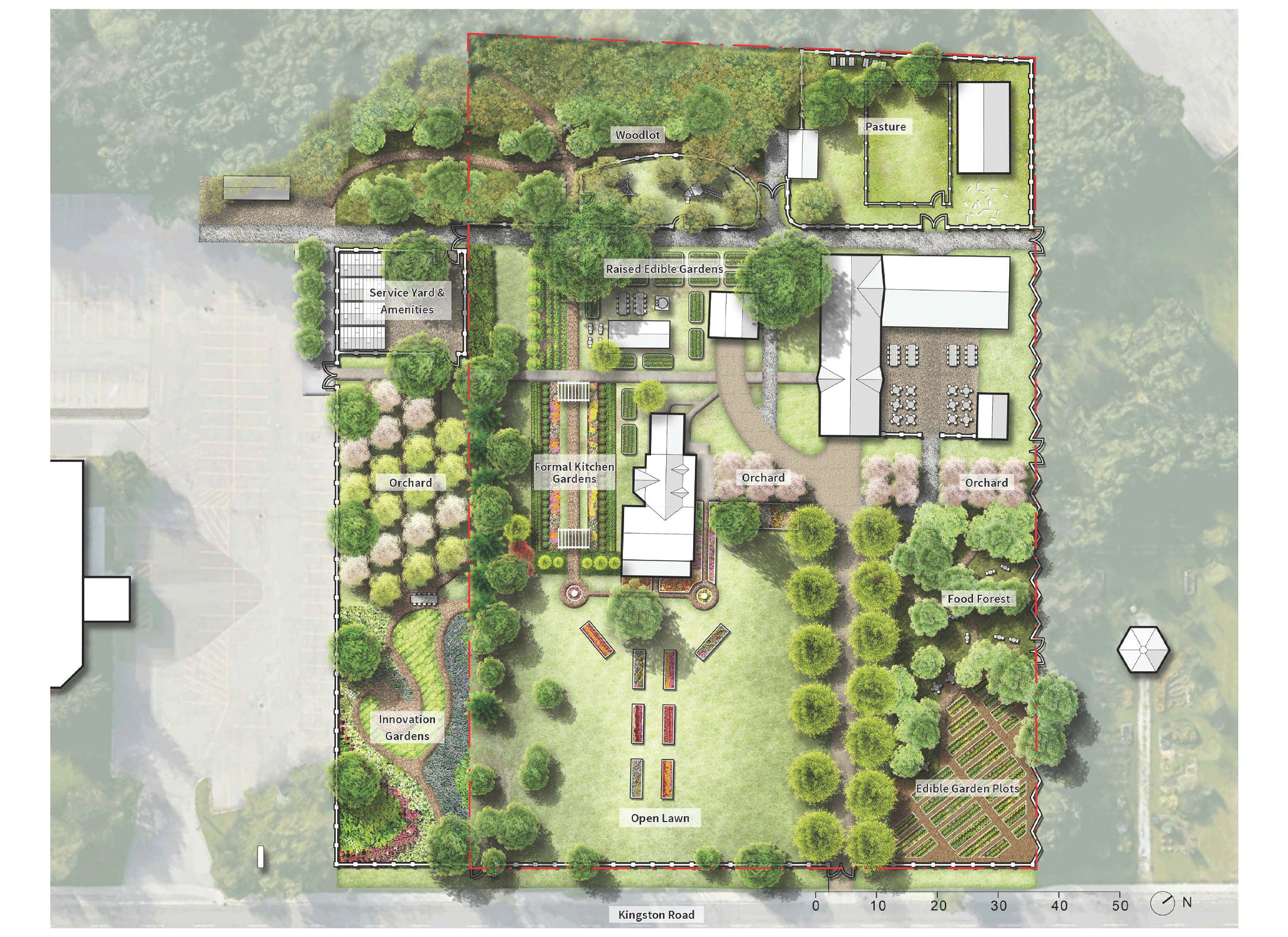 The plan set the framework for a rich and dynamic community space that provides food production and educational opportunities that enhances the health and well-being of the community while making key historical and contextual themes legible to the public once again.