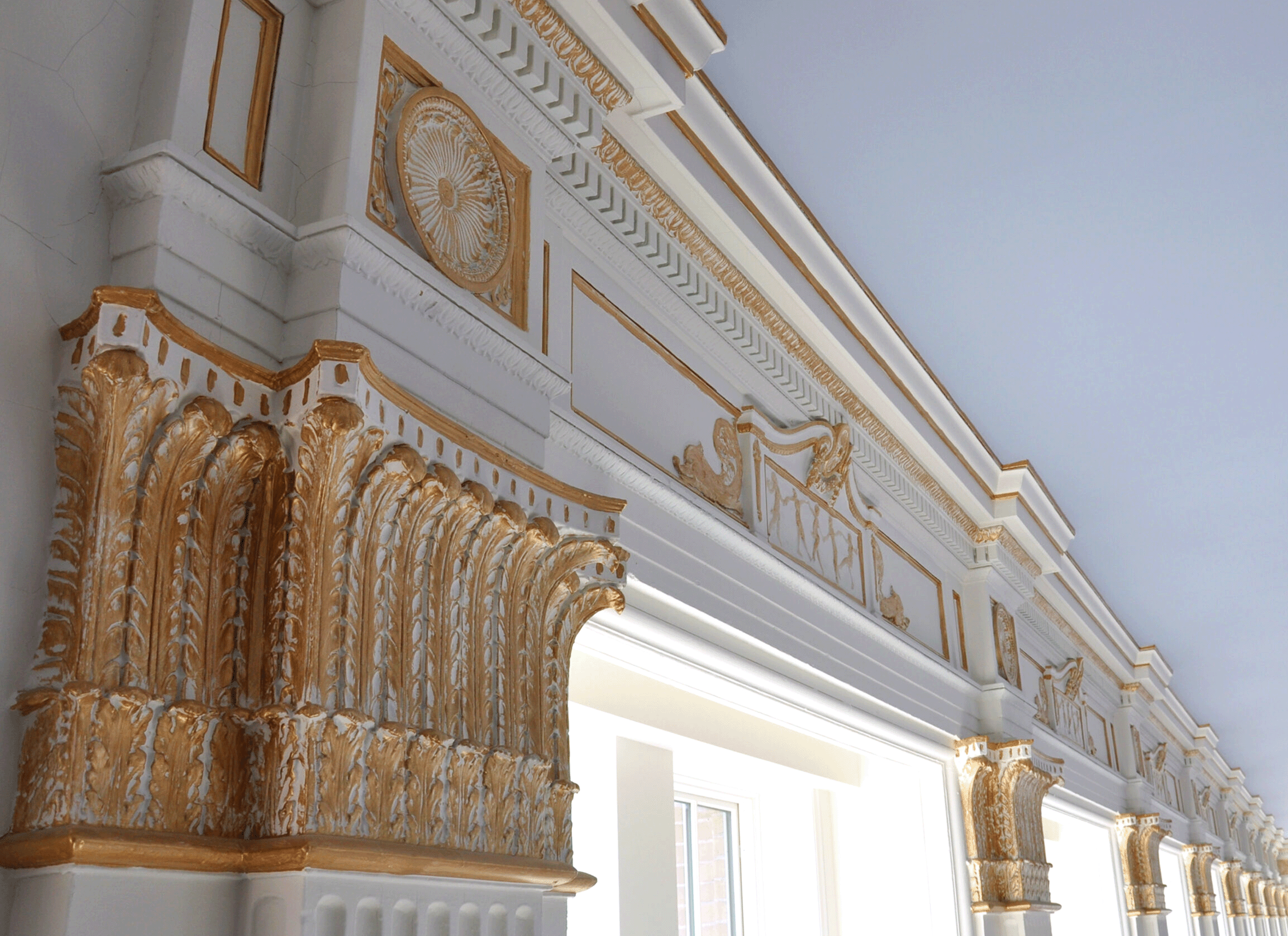 Although damaged by 50 years of use, the majority of the neo-Classical plasterwork in the Ballroom remained in relatively sound condition, and ERA was able to retain it in place with selective repairs. The wood wainscoting had also been badly damaged over the years and was replicated, with new enclosures installed below the double-height windows to conceal new heaters. The entrance from the Pre-Function space into the Ballroom was returned to its original configuration through removal of a later wall. The serving doors at the northeast corner of the Ballroom, originally connecting to the 18th floor kitchen, were also retained.