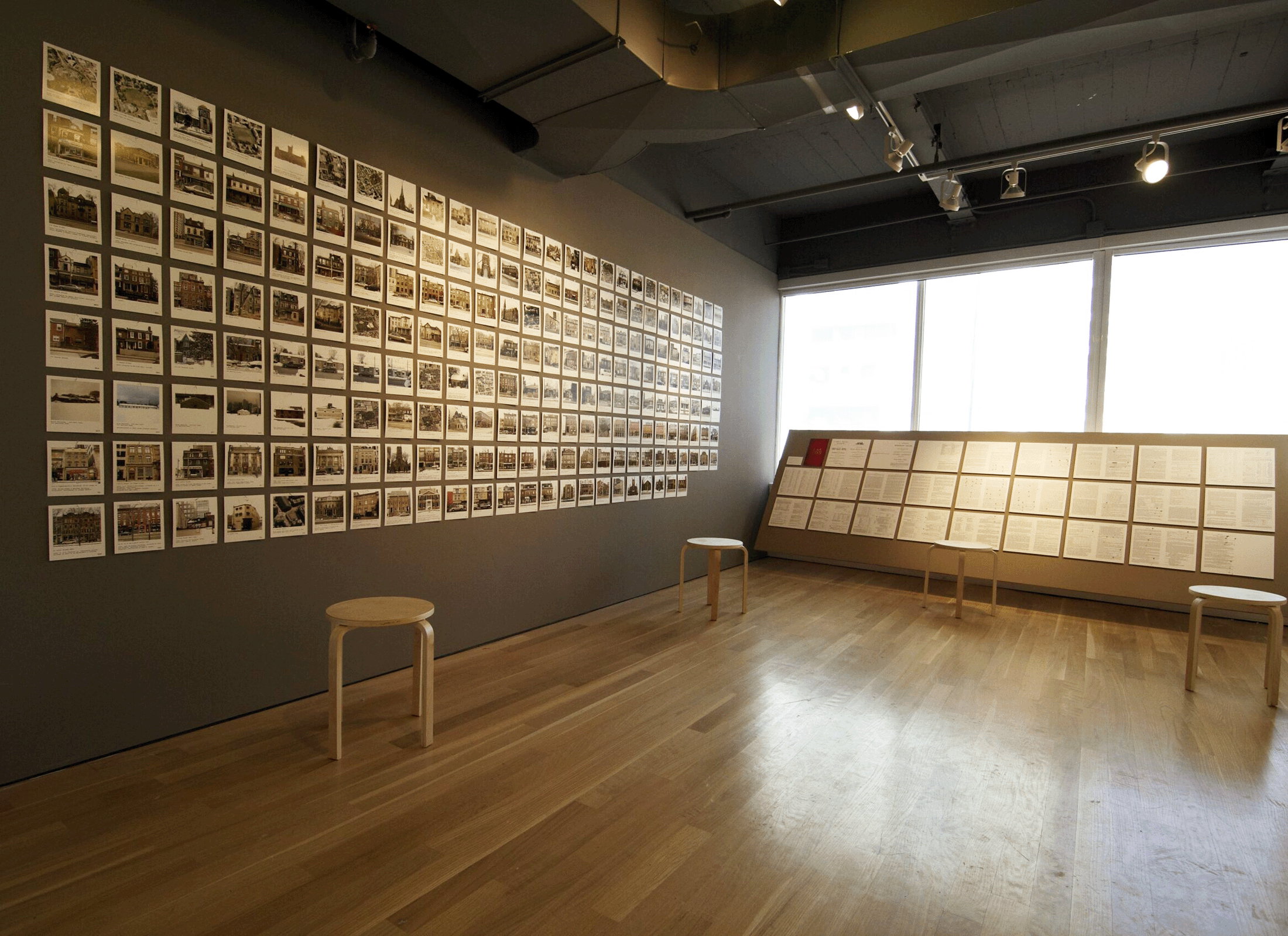 For the installation the 1858 Boulton Atlas (one of the city’s earliest maps) was recreated on a massive scale. ERA spent several months investigating the buildings shown on the map and through our research we were able to identify 205 properties that remain today. Simple snapshots of these Boulton-era buildings and urban spaces were presented as documentation of their present-day condition. This research was accompanied by a detailed description of contemporary city life that was taken directly from the pages of the 1856 City Directory. All references to the buildings and spaces that remain were identified and cross-referenced using a colour-coded, numbering system.