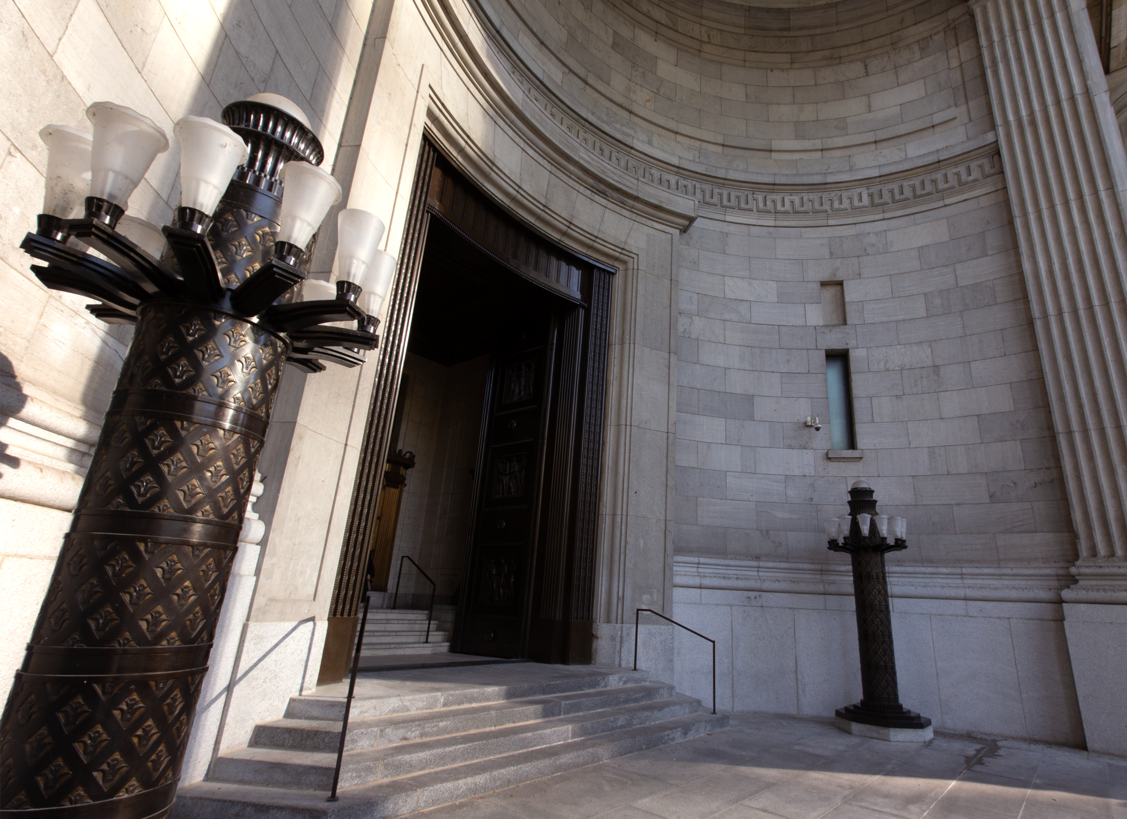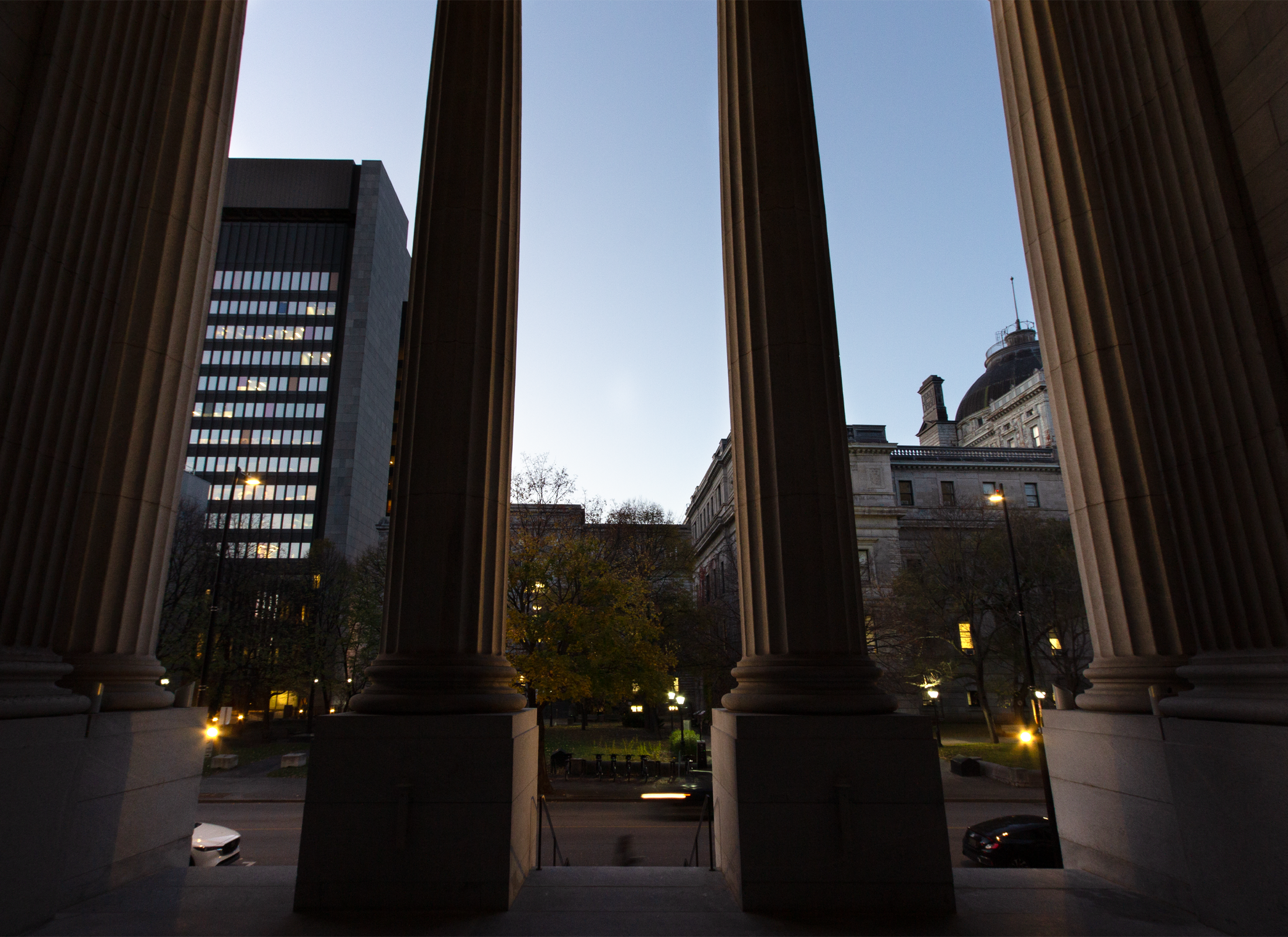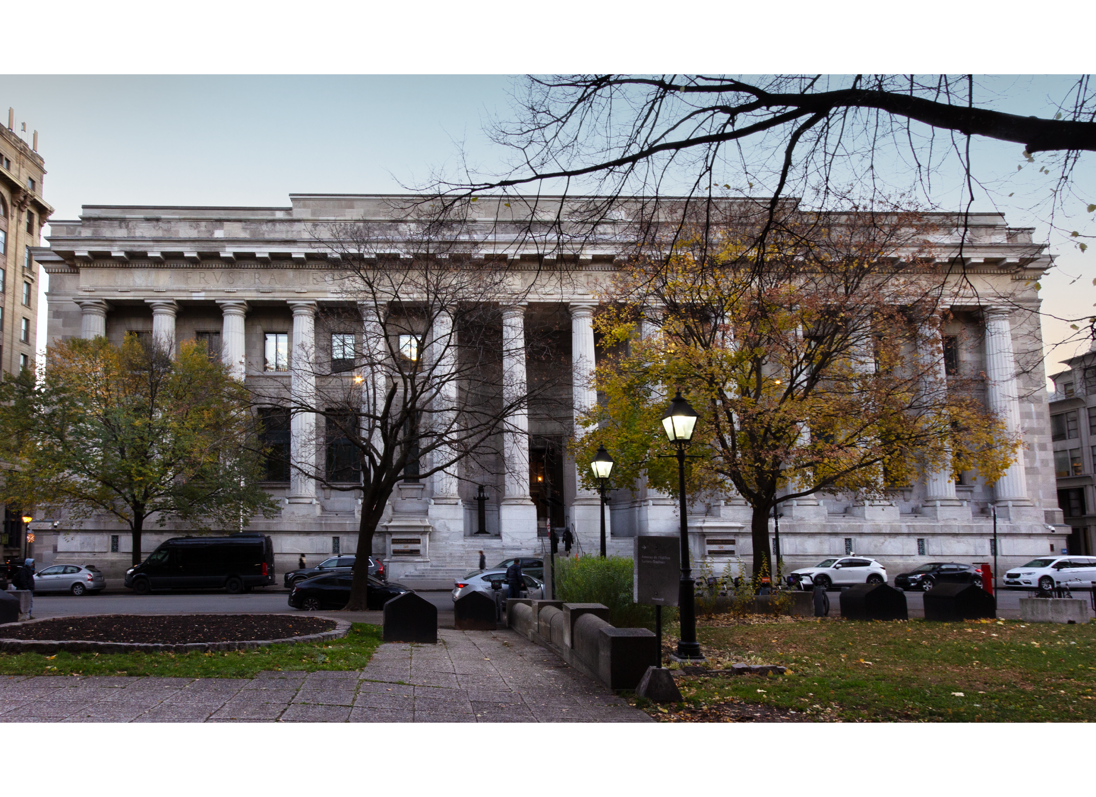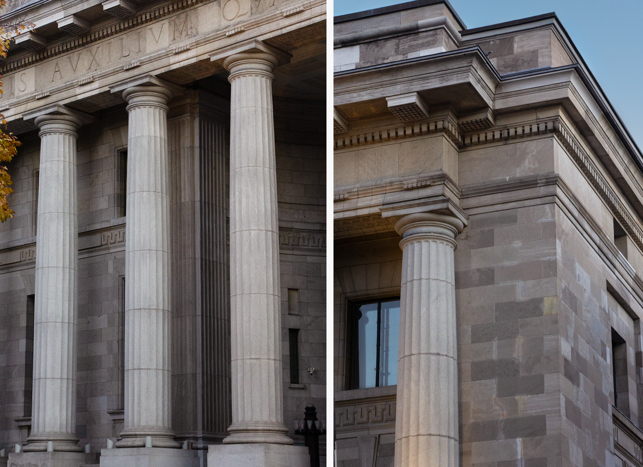 The Cour d’appel du Québec is a late and particularly modern take on Beaux-Arts neoclassicism, and is notable for its giant order columns along Notre-Dame Street, its semi-circular entrance porch, its projecting cornice, and its fine stone masonry.