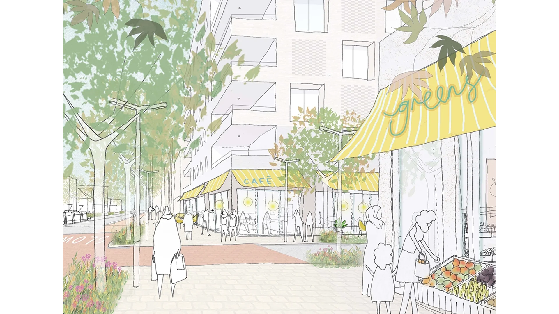 A tree-lined corridor running the length of the neighbourhood establishes a new east–west pedestrian and cycling route. Intersected by new north–south streets, this landscaped passage restores permeability, enhances sightlines, and creates safe, welcoming connections between homes, parks, and community amenities.