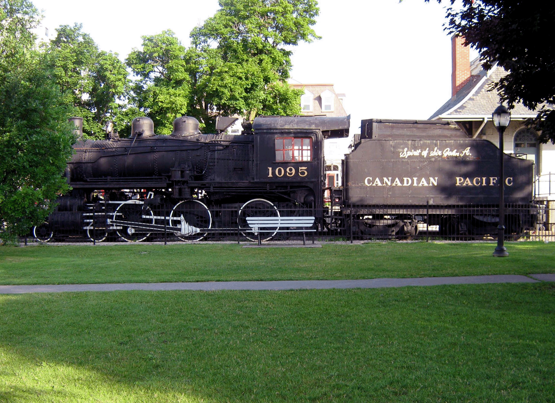 Confederation Park was opened in 1967 to mark the centenary of Canada’s confederation, on the site of the disused CPR rail yard and the earlier Market Battery fortification. Locomotive CPR 1095 (named, “The Spirit of Sir John A.” on occasion of the centenary) was built by the Canadian Locomotive Company Ltd., in Kingston, in 1913, and has been located in the same place, on original rails, since Confederation Park opened to the public in 1967.