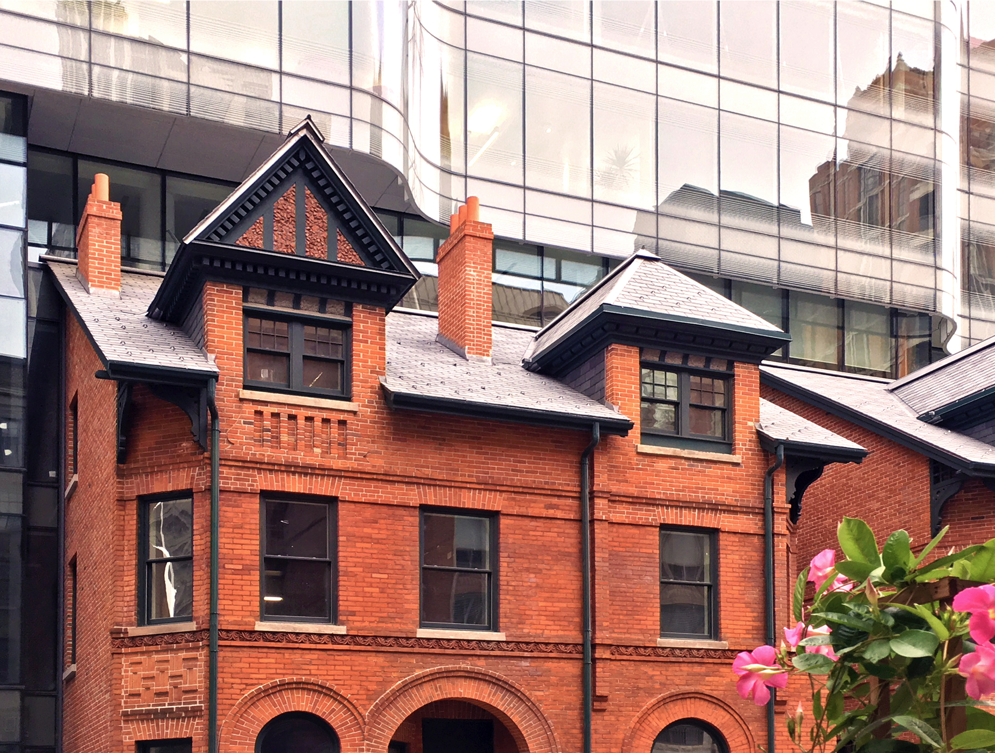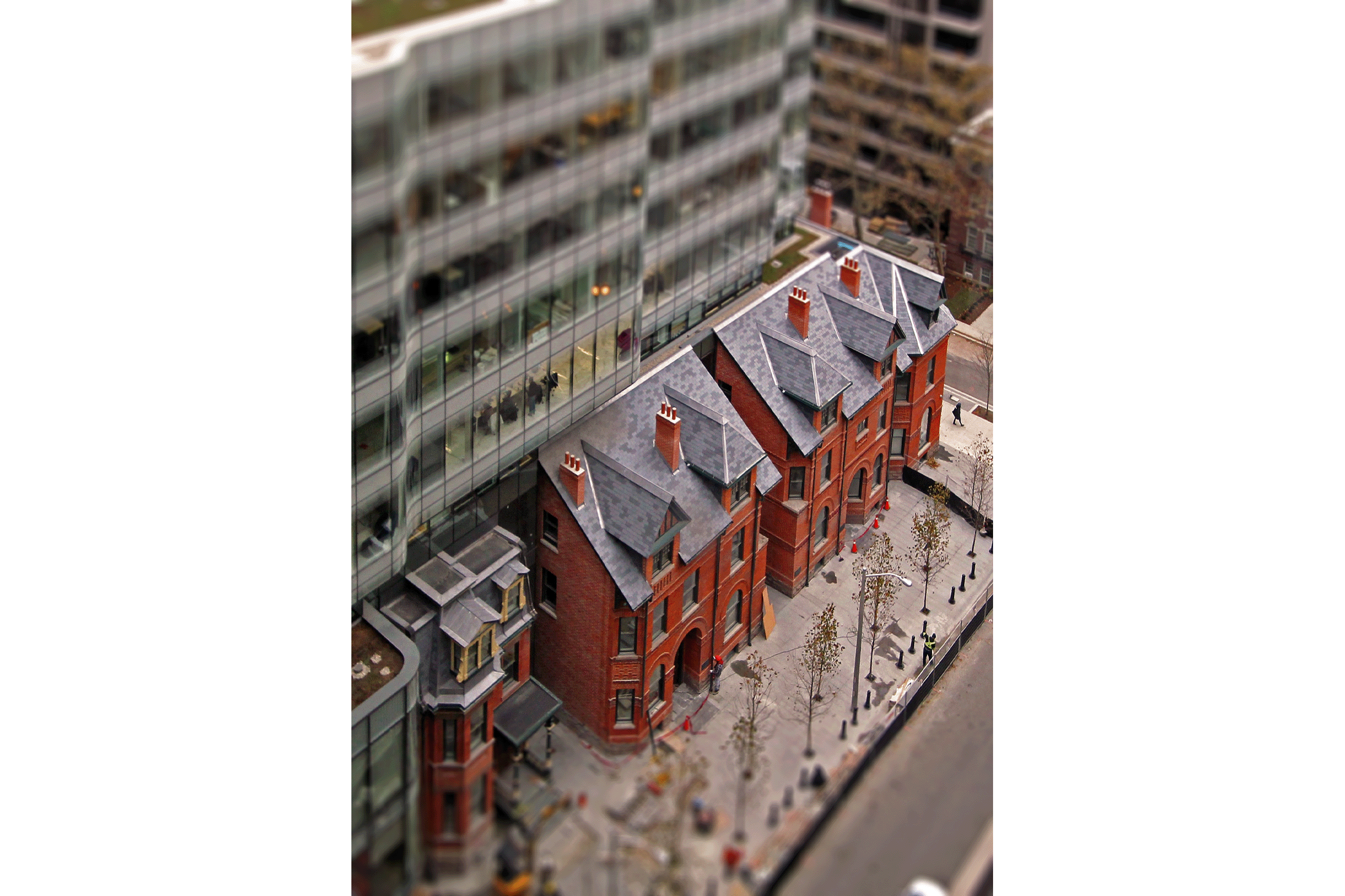 The late 19th-century three-storey red-brick houses are excellent examples of the Romanesque Revival style. Heritage conservation work included restoring the masonry, windows, trim, dormers and sloped roofs, seamless integration of the interior spaces between envelopes, and limited interventions to provide modernized assemblies and fire protection. The wood roof forms were precisely recreated with light-gauge steel framing with often minute adjustments to allow for the re-installment of catalogued and restored original exterior trim and detailing.