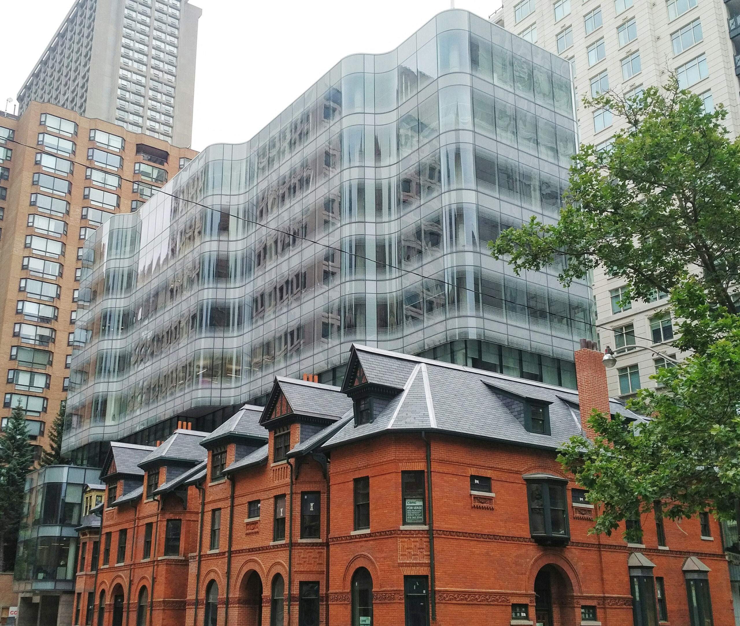 7 St Thomas integrates a sleek, undulating fritted-glass mid-rise office building designed by Hariri-Pontarini Architects with a block of heritage townhomes. The site inhabits a transitional zone between the retail and corporate fabric of Bloor-Yorkville and the quiet, leafy collegiate campus to the south.