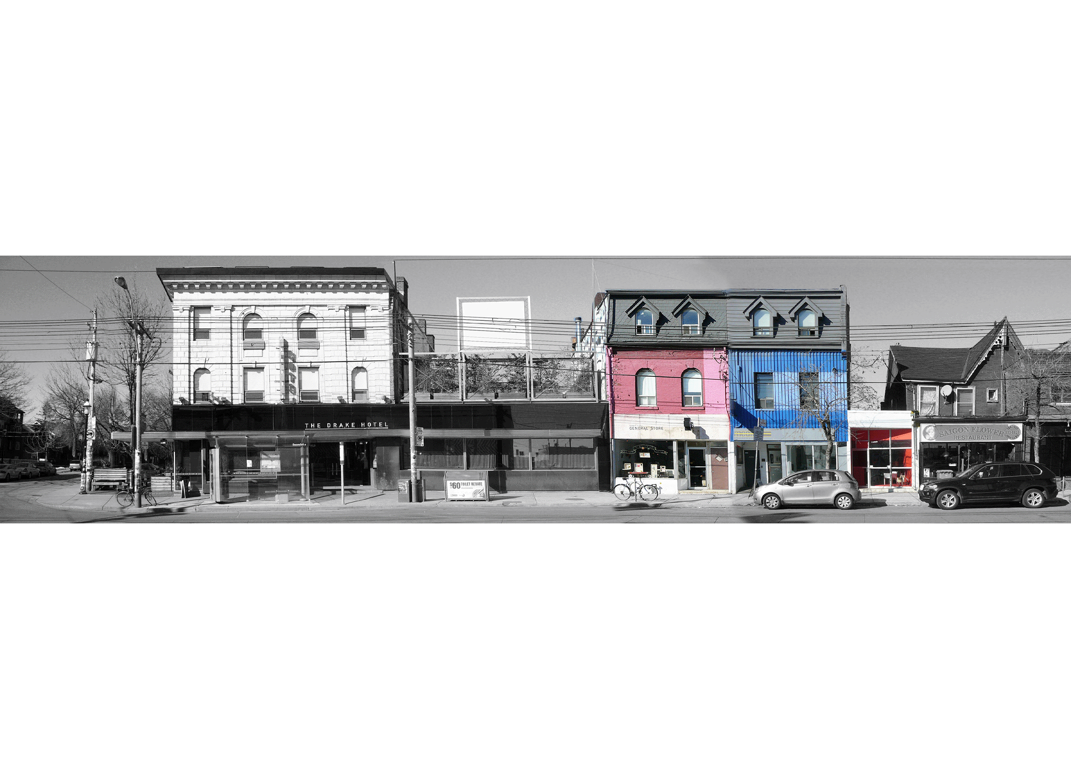 The Drake Hotel is a cultural landmark within Toronto’s Art and Design District. In 2001, the original 1890’s building at Beaconsfield and Queen Street West was reinvented into a unique mixed-use hub where sleeping, dining, nightlife, concerts, retail, and art events collide. Continuing on this success, the Drake Hotel is growing to include the storefront buildings at 1140-1148 Queen Street West.